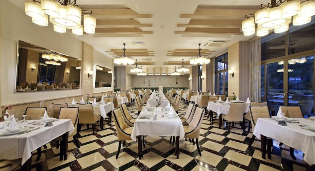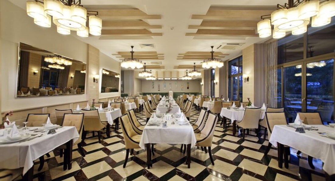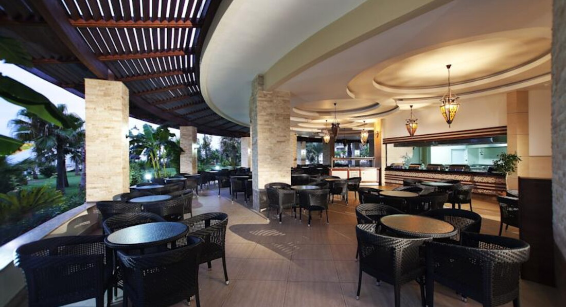 Бари та ресторани: головний ресторан розрахований на 1500 осіб (критий, з кондиціонером, літня тераса, дієтичне меню, дитячі стільці), лобі-бар (24 години, платно), бар на пляжі (10:00-18:00), Ottoman -бар (10:00-24:00), бар біля басейну (10:00-18:00), диско-бар (23:00-02:30, платно) та ін. 2 ресторани A La Carte: італійська, турецька - платно, за попередньою резервацією.