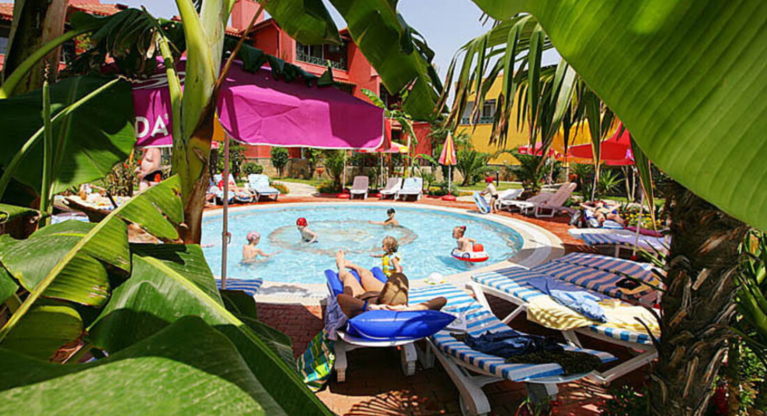доброго всем времени суток! Отдыхали с женой. прилетели в Анталию в 07.00 утра. в отель приехали в 09.00. высадили нас из автобуса и сказали до свидания! На рецепшн одели браслеты. Ждите! Вопрос чего нам ждать? Ждите 14.00 говорят нам! То есть тусуйтесь ребята пять часов где хотите! Дурдом! причем отель был не полностью заполнен и номеров пустых было много. Но сколько мы не подходили и не просили, бесполезно. В 13.30 свершилось Чудо! дали ключи. пошли в номер. Зашли в номер, распахнули занавески и видим в окне, на расстоянии 20-30 метров от балкона СТРОЙКА!!!!!! Ура! Строят новый отель! рабочие долбят перфоратором! Пыль столбом и т.д.........!!!!! Прекрасно! развернулись и назад на стойку администратора. Говорим, Что за дела? они нам - у вас стандарт с видом на окрестности! получите с видом на стройку. причем ни где и ни кто нас не предупредил что идет стройка прямо напротив отеля. ругались ругались, дошли до деректора или управляющего, не знаю кто он, тот предложил бунгало с видом на сад с доплатой 30$ в сутки! я говрю, ни копейки мы вам не заплатим. На писано у вас с видом на окрестности, давайте на окрестности, было бы написано с видом на стройку я бы промолчал. После получасовых переговоров дали номер с видом на бассейн. на 1 этаже. Кондиционер центральный, до 1 июня сказали не работает. это с одной стороны было хорошо, так как под окнами как раз стояли эти кондиционеры. Если бы работали, то весь гудеж и шум был бы у нас в номере. Вечера не жаркие, так что можно было спать с открытым балконом, но до 04.30 дискотека в соседнем отеле и все слышно. дверь не закрыть балкона, становиться душно. вобщем жили так 10 дней. Еда неплохая, разноообразное меню. фруктов ассорти мало. яблоки (вкусные), груши, алыча, персики и нектарин (бескусные и деревянные), один раз дали клубнику, пару раз дыню, один раз арбуз. Выезд был ужасный. тур оператор Санмар уроды конченые! На листочке у админ. вечером 25 мая написано был наш рейс 08.25. сбор в 04.30. пришли в 4.30 с чемоданом. народ сидит ждет. автобуса нет, гида нет. представителя тур оператора нет. администратора нет. вобщем никого нет. ждали ждали потом начали звонить везде где только можно. трубки не берут. телефоны выключены. вобщем так сидели до 06.00. потом решили идти в номер. утром выяснилось что рейс задержан до 17.25. забралли с отеля в 13.30. и извините никто не сказал. вот! А САМ ОТЕЛЬ Хороший! )))) наш персонал гавно! а отель хороший!