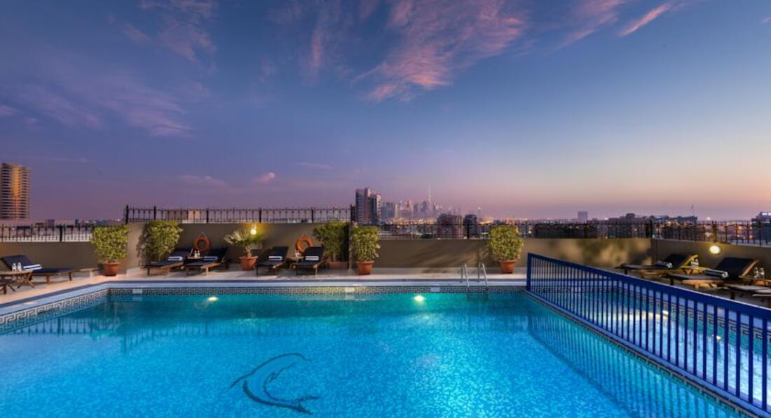 Территории у отеля, как и у любого другого городского отеля совсем нет, выходишь из холла отеля и попадаешь сразу на проезжую часть, столовая тоже не большая, находится на первом этаже с окнами опять же на проезжую часть. Но нужно отдать должное бассейну, который находится на крыше отеля ( это 8 этаж), сам бассейн не большой, купаться желания не было, хотя многие купались, столики и лежаки вокруг, места были всегда. С крыши хорошо виден новый район дубая - небоскребы и самая высокая башня бурдж халифа, особенно красивый вид ночью.