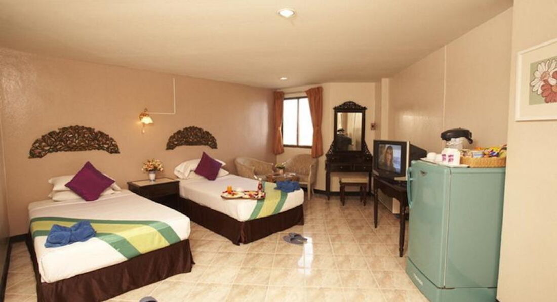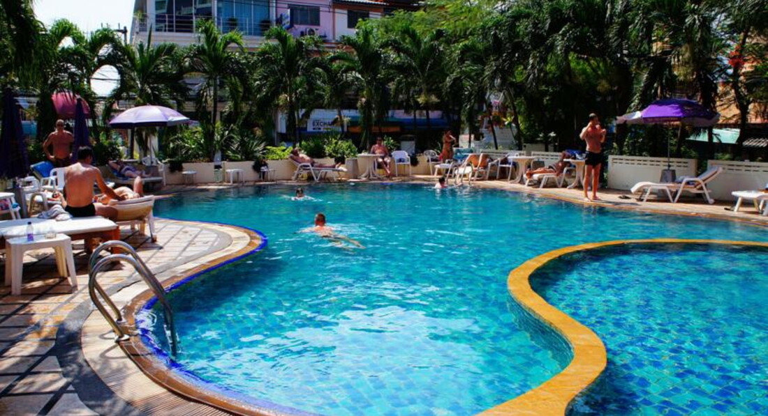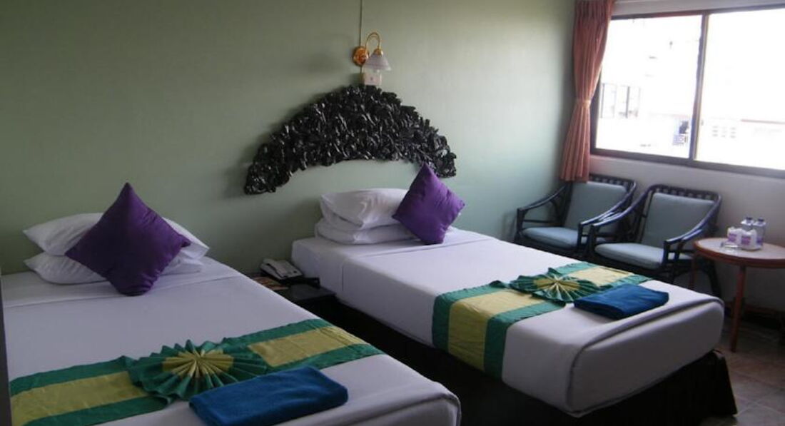 Мы в Таиланде в первый раз ездила я с парнем,на 10 дней приехали отель симпатичный внешний вид ,дали номер на четвертом этаже номер 425 стандартный первое впечатление кошмарики правда кровать одна большая и удобная)),номер входил на боковую сторону очень хорошо ,два раза кафе одно есть там с боку днюху справляли до трех утра песни тайки орали просто жесть)на улицы трансики стоят кругом грязновато ,воняет на улицах ужас((.завтраки каждый день одно и тоже но сытно и вкусно все свежее скучаем по ананасикам и арбузикам).рынок с фруктами есть рядом на лево 300 метров.волкин на тук туки 7 минут.все развлечения рядом не скучали вечерами.днем первые два раза сходили на городской пляжек купаться можно но обычное море ничего нового грязновато.потом все дни ездили на острова лично мы на тиен наш любимый))))ммм скучаеммммм)еда в кафе нормальная наелись креветок огромных супчиков всяких.ездили на массаж слепых там надо выбирать и знать поспрашивать мастера хорошего не все хорошо делают обманывают у них массаж стоит 140 бат всего надо ехать до дельфинов там спросите все знают где это от отеля минут 10-15 ехать во общем в центре жить я конечно жить больше не хочу планируем на джамтьене пожить.на острова всем советую поездить очень круто).у нас на дорогу до островов выходила на двоих туда обратно 360 бат.вообщем отдых удался весело,позитивно,и теплооооооо и солнечно !!!!!хотим!хотим!ещеееее)))