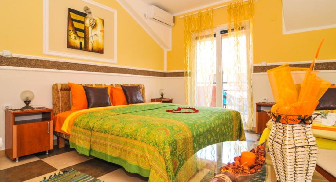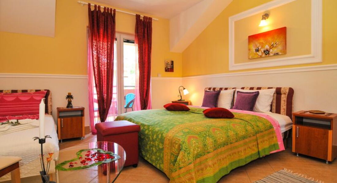 APP 1 (4 особи): 58 кв.м., 2 поверх. Спальня з трьома ліжками, терасою, вітальня з виходом у сад, всього 4 місця + дитяче ліжечко.
