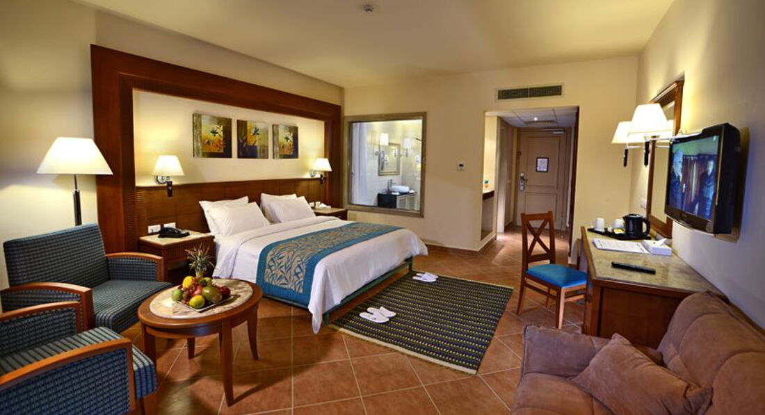 Отдыхали семьей с двумя детьми с 7 апреля 2017. Приехали в отель рано, где-то 9-30. Положили в паспорт шоколадку и 5 долл чтобы не ждать долго заселения. Заселили быстро, но за браслетами сказали подойти в 10-30 это чтобы завтраком наверное не воспользовались) заселили в здание рядом с главным рестораном на третьем этаже с видом на море и стройку)) просили первый этаж, сказали что есть лифт( который часто не работал). Номер уютный, мебель добротная. По ночам было очень шумно, не давали уснуть их местные. Все что-то бегали орали. Один раз даже в три часа ночи выходила их утихомирить. Лучше не заселяться в этот корпус. Я так и не поняла что значит супер все включено. За водой ходить нужно самим, про туалетную бумагу постоянно напоминать, в туалете у бассейна ее вообще не было. С полотенцами тоже целая проблема. На четверых оставляют два полотенца, хотя не раз говорили уборщику. Сегодня оставит, завтра заберет)) Через ресепшн эти нюансы решались по 40 мин. В главном ресторане вообще нет туалета. Нужно идти на ресепшн мыть там руки и возвращаться назад. Бред полный. Питание вообще не разнообразное. Изо дня в день одно и тоже. Обещанного мини бара с местными напитками мы так и не увидели у себя в номере. По приезду в номере не было комплимента от отеля. Приглашения в рестораны аля карт так и не получили. Хотя было обещено. Все нужно ходить и напоминать. Что это за сервис? Территория очень маленькая. Мы знали что в апреле комаров много, поэтому запаслись раптором) Аквапарк понравился. Есть чем себя развлечь. Анимация скукота. Вечерние шоу вообще ни о чем. Про детский клуб ничего сказать не могу мы туда не ходили, но три раза за неделю видели как бросались тортами (это такое развлечение) на мини диско дети ходили всегда. детский аквапарк не плохой. единственное горки где лилась вода сверху практически всегда пустовали, т.к. вода холодная и очень пугала детей. на пляж ездили на автобусе. вход в море такой, что можно ноги поломать. глубина до буйков по бедра. пирс на ремонте. ходили нырять с соседнего пирса. ездили на маршрутках на рынок, в сохо, голливуд парк. называли свою цену и ехали. больше двух долл не платили. экскурсии брали у {удалено модератором; несанкционированная реклама} на рынке. Иерусалим 70 долл, сафари 7 долл. Гораздо дешевле чем в отеле. там же можно купить и фрукты. Клубника по 1 долл, манго по 7 долл, арбузы по 4. За пивом в бар ходить нужно женщинам) муж пойдет для него нету, я пойду нальют) Вино в ресторане пить не возможно, реально разбавлено водой. В лобби баре всегда все было и все соответствовало, т.е. вино было вином).