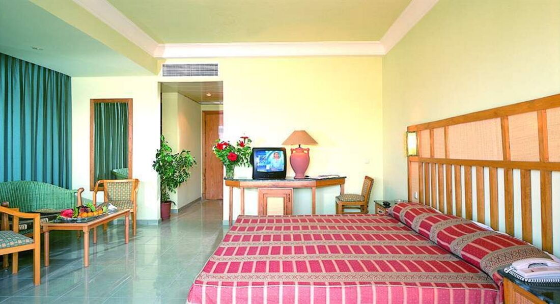 Минусы номера: Маленький, дизайн - какой-то совковый, покрывала на кроватях как в 50-60 годах в ссср (По виду того же возраста , одно еще и с дыркой),телевизор вроде есть, но вещь бесполезная в принципе, 8 арабских каналов идущих вдобавок с отвратительным качеством , света как такового - кот наплакал, одна лампочка между кроватями, был еще и торшер, но он сдох ч-з 2 дня, и еще одна лампочка над телевизором в нише (ума не приложу зачем она там) тоже умерла почти сразу, в номере есть пара таинственных выключателей назначение которых, видимо, известно ток египтянам, ибо они просто есть сами по себе, и ниче не выключают. Розетки вроде должны быть но одну нашли сразу(торшер был включен) остальные две обнаружились дней через пять и то случайно,с помощью логических размышлений. Телефон - не работал. В номере было холодно, попытались включить кондиционер на обогрев - фиг нам, вентилятор крутит , ни тепла ни холода нет, вердикт - сломан.