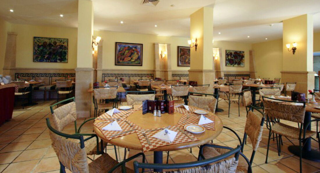 Ресторан один, небольшой. Отель работает по системе "завтраки и ужины", обеда нет. На завтрак всегда одно и то же: вареные яйца, свежие огурцы, помидоры, маринованные овощи, 2 вида хлопьев, молоко, 1 вид колбасы , сыр нарезанный и плавленный в треугольничках, мёд, джемы, булочки всегда свежие и вкусные, 2 напитка (каркаде и что то типа апельсинового морса), чай, кофе. На ужин: рис, макароны или картошка, курица, рыба, говядина, несколько салатов, тушеные овощи, выпечка, пудинги, желе, фрукты. Всё очень вкусно. И обслуживающий персонал постоянно следит за чистотой. На столах всегда есть столовые приборы, салфетки с символикой отеля.
