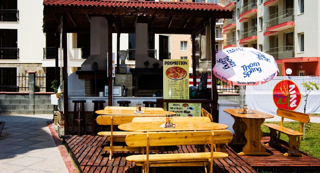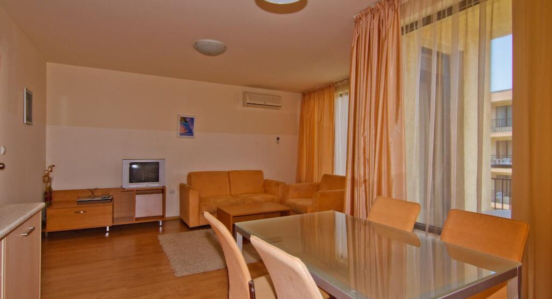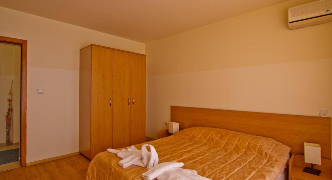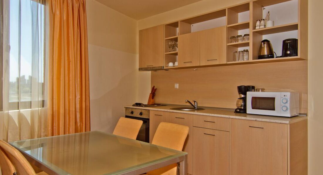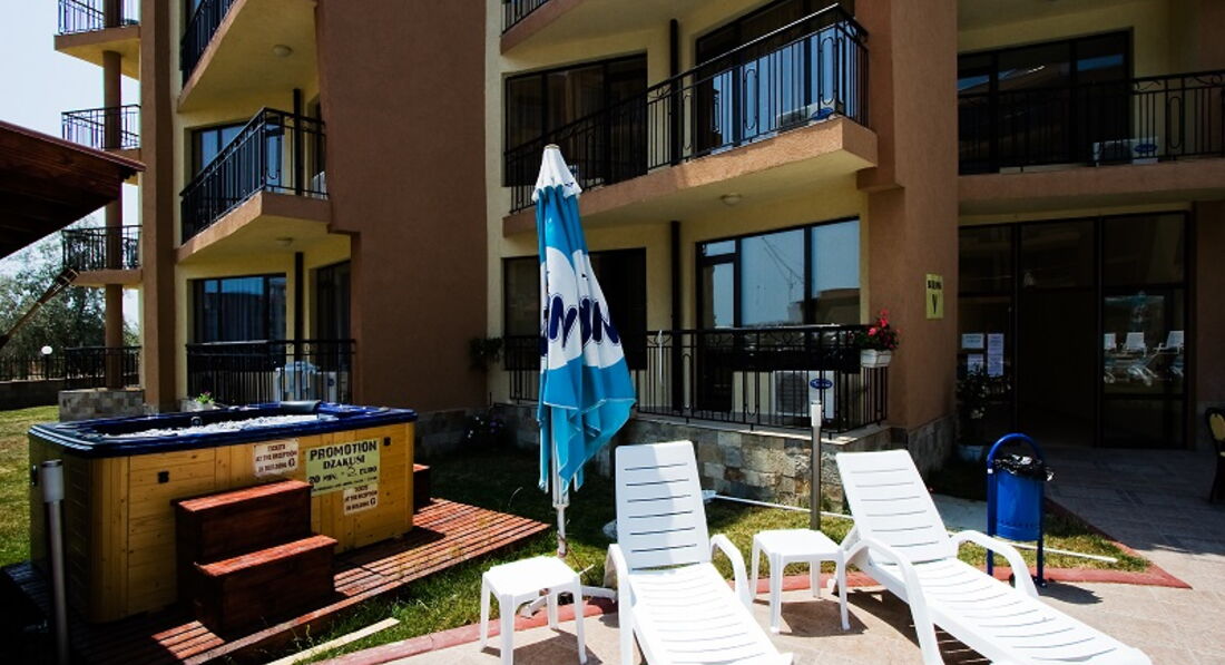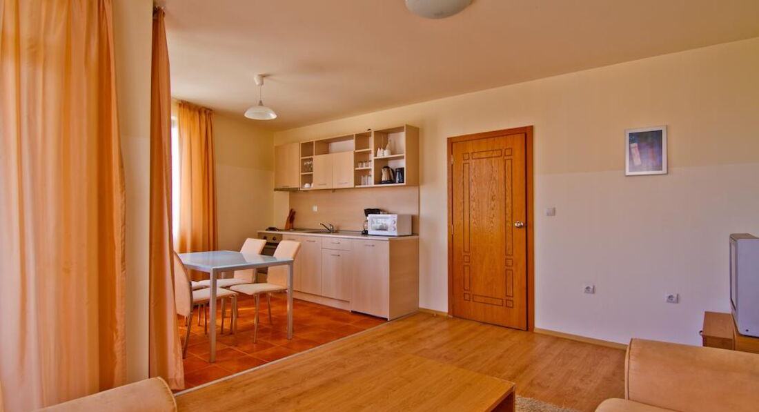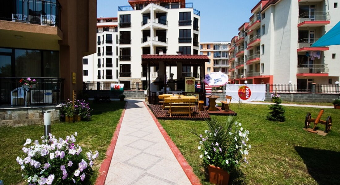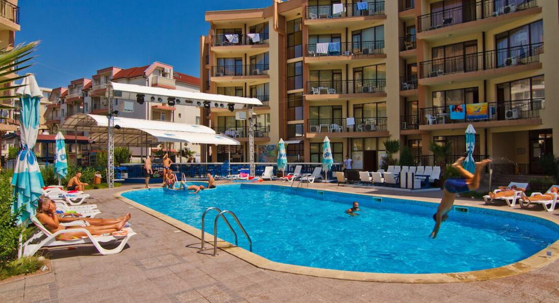 Доброго временеи суток ! Отдыхала в отеле в сентябре 2014г. Хочу сразу предупредить что этот отель как отель воспринимать не стоит скорее это квартиры- аппартаметы с дополнительными услугами . на территории есть свой бар бассеин мангал и самое интересное экран для просмотра кина на открытом воздухе. Так же есть прачечная платная. Вай фай хорошо ловит возле бассейна. Персонал не навязчивый очень приятный говорят на русском . до моря нужно идти но это своеобразное развлечение в тихом пляжном отдыхе. На пляже распологаеться популярный клуб какао-бич это самое тусовочное место курорта. в 20-25 мин хотьбы распологаеться старый город Несебр исторический памятник очень интересно и красиво. Номер-квартира очень удобная в угловых номерах два болкона из каждой комнаты два кандиционера так же номер оснащен кухней совмещеной с комнатой отдельный сан узел с душевой унитазом раковиной и боллером а это значит горячая вода есть всегда .кухня оснащена посудой микроволновкой электрической плитой и минихолодильником . В номере есть телевизор 4 русских канала показывает хорошо. В целом я отдыхом осталась довольна, так же можно сьездить на рынок кубана проезд в автобусе стоит 2 лева-50р. Сувениры лучше покупать в Несебр там и выбор и дешевле . Море идиальное чистое хороший вход охраняемый купаться одно удовольствие. Единственый минус это бычкы в песке но это сами туристы и виноваты , люди не сорите там где отдыхаете ! приятного отдыха !