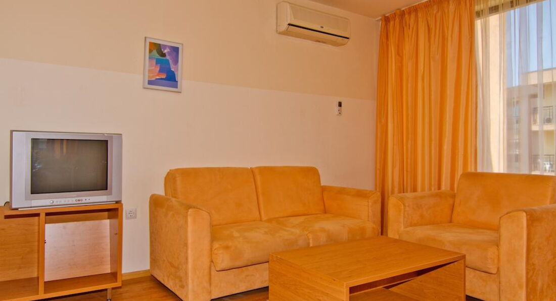 one bedroom apartment (вітальня та спальня з двоспальним ліжком, суміжні двері, ванна кімната, у вітальні є обладнана міні-кухня, розкладний диван та розкладне крісло, макс. 4 дор.+1 дит., 60 м2).