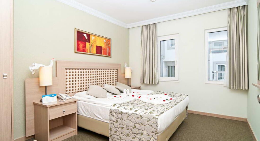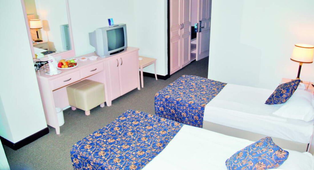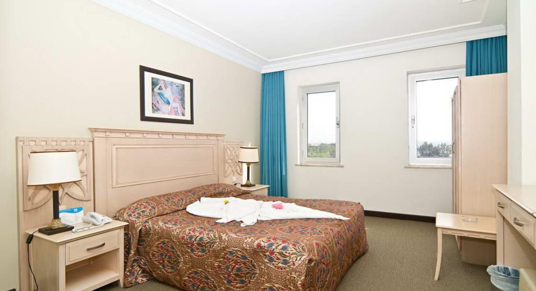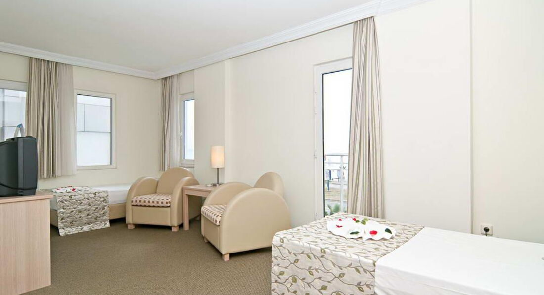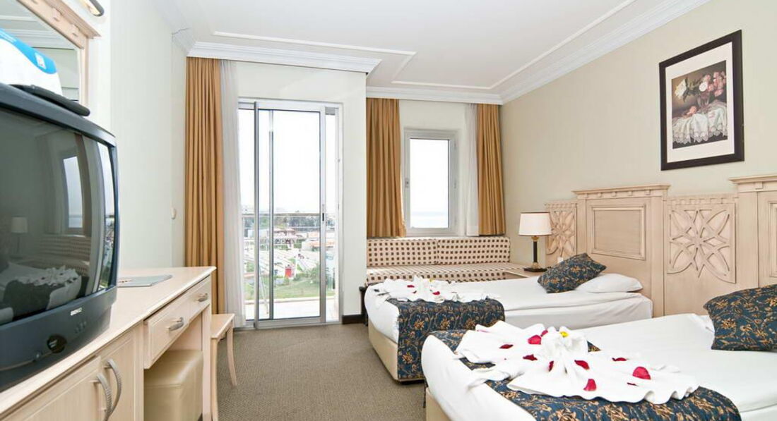 Отдыхали вдвоем. В Турции впервые. Приехали около 15.00, заселили через 15 минут. 4 этаж, номер с видом на город и море. В номере все было аккуратно убрано, чисто. Тапочки, принадлежности в ванной, все в наличии. В шкафу небольшой сейф, очень удобно. Телевизор с большим плоским экраном. Маленький холодильник, в который каждый день ставили две бутылки воды. Кондиционер работал плохо - в июле там наверно было бы ужасно душно и жарко. Но мы просто так включали его проверить, в октябре было жарко, но терпимо. Вай-фай работал медленно, иногда был отключен несколько часов, тем не менее, каждый вечер удавалось позвонить домой родным по скайпу. Уборка ежедневная, к ней претензий нет. Иногда оставляли по доллару горничной. Правда, никаких особых бонусов за это не было ) Только один раз красиво свернули простыню.