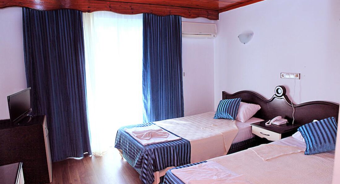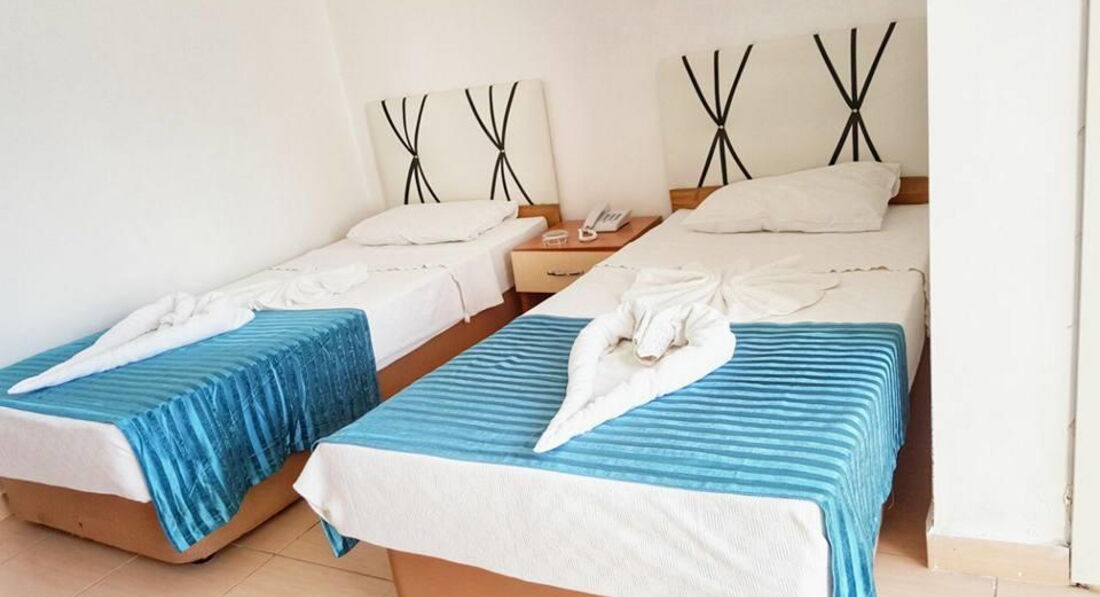 Все началось с того, что мы очень долго выбирали город и отель, потому что это была наша первая поездка в Турцию. С первого же раза мы наткнулись на этот отель, оценив его, мы продолжили поиск. В течении 3 часов мы вернулись к нему обратно, так как поняли, что лучше мы не найдем ( на 85 % мы обращали наше внимание на вид пляжа,на его расположение), с чем мы ни капельки не ошиблись. Мы еще молодые, студентки, решив, что основное наше время мы будем проводить вне отеля (имеется ввиду комнаты), решили не так обращать внимание на те минусы, которые перечислены ниже. Что и это нас не подвело. Сразу же приехав, нам истолковали общие правила отеля и сразу же заселили в номер, чему мы были рады. В основном в номер мы приходили только спать. А так в плане состояния нашей комнаты я могу сказать только то, что нас все утраивало, и в плане ванной комнаты (правда немного вода у нас из душа протекала, но это нам не помешало), и в плане кондиционера, который всегда выполнял свою работу,когда нам это требовалось; полотенца меняли каждый раз, когда нам это было нужно. Ну и конечно же вид с балкона был просто потрясающим, не считая перезагораживающего объекта, точнее названия отеля. Особенно сильно впечатлил нас пляж и вид на море, здесь уже у меня только восторг. В первый день я плавала только на берегу, ну а уже в последующие дни я заходила в море только через пирс. В чем же их различия: на берегу здорово купаться до обеда, но после обеда на берегу появлялись только мелкие водоросли, которые ничуть не мешают плавать, и все это объясняется тем, что в пляж, который расположен рядом с нашим пляжем, приплывали яхты и корабли, проводящие морские экскурсии, и это все потому, что только наш пляж владел таким замечательным видом. Честно говоря, зрелище превосходное (особенно на фотографиях). А когда уже спускаешся на воду через пирс, то там все время вода чистая. Так же есть островок, который считается домом черепах, и мне кажется, здесь тоже есть свой плюс, так как не везде вы сможете увидеть таких больших черепах плавающих рядом с вами. Начиная тему питания, то меня всё устраивало, то ли из-за того, что я все время находилась в море, то ли действительно все было вкусно, чувства голода у меня не возникало. По вечерам проходят дискотеки, где каждый зажигает так, как может. Везде присутвует дружелюбная, домашняя атмосфера. В общем все было только замечательно. После отдыха у нас и чувство сожаления не было. Только одни положительные впечатления в памяти.