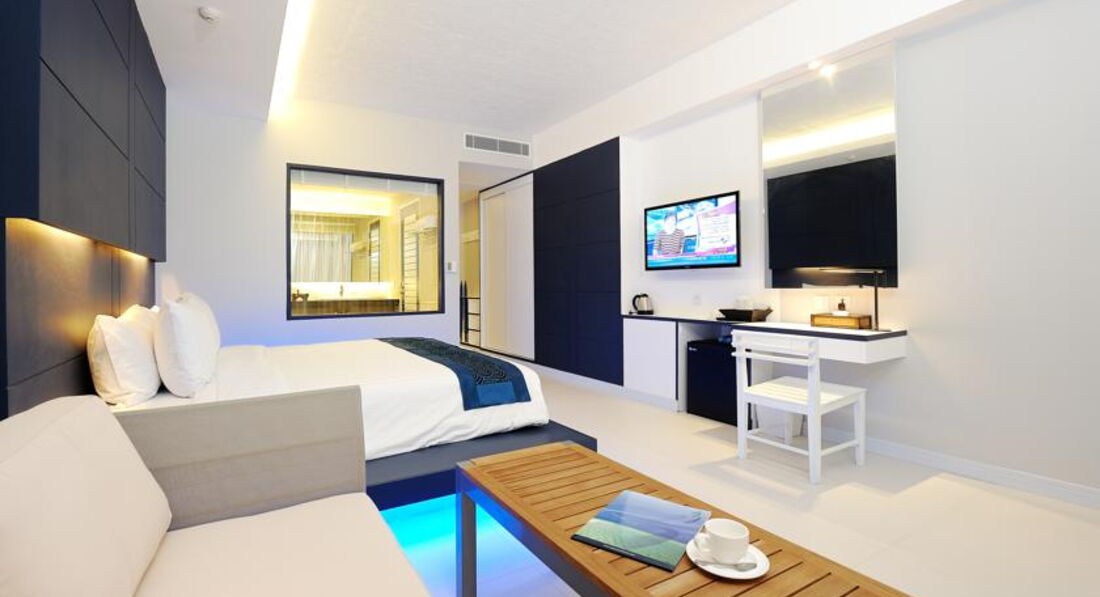 Сам отель можно ставить 5-! Минус из за заселения. Прилетели рано утром.до отеля добирались на автобусе примерно час. Заселение происходит в 14-00 не раньше, т.к. Туристов осень много. Русских в этом отеле мало. Много китайцев, японцев, немцы тоже есть. Пока мы ждали заселения решили сходить на пляж ! Он превосходный! Чистый песок ! Прозрачное море! Но в первые 2 дня жутко кусался планктон.. Неприятное ощущение ((( потом он пропал. Видимо был прилив. Дождавшись 14 часов мы вернулись в отель заселяться . Номер у нас был взят с видом на море и со своим бассейном ! Всем советую!!! Разница от обычного номера тысяч 6!!! Но удовольствия намного больше. В номере собственный сейф, кондей, собственный бассейн на 3 номера, кровать с синей подсветкой как на фото)) уборка каждый день с 10 до 16-всегда было хорошо убрано! Полотенца менялись. Так же были одноразовые тапочки и халаты. Есть гель для душа, шампунь и все необходимое!!! Так же в номере есть зеркало, шкаф, мини диванчик , комод и тумбы) разметки наши!)