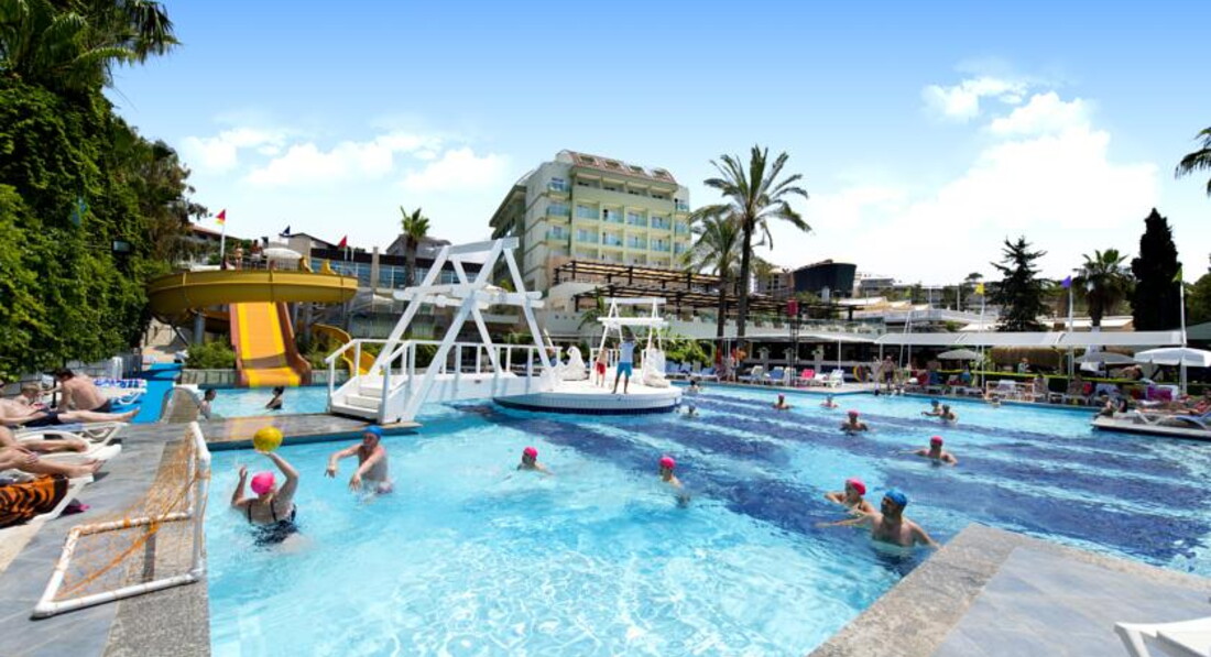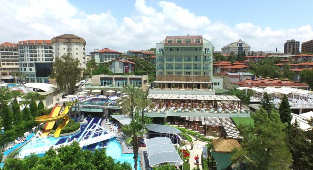 Вот вчера только прилетели и делюсь своими эмоциями. Отдыхали мы с друзьями, 3 взрослых и детки одному 10 лет и 3 года. Что хочу сказать, отель выше всех похвал! Уютный, утопает в зелени, чистота везде, персонал отличный. В связи с тем, что у меня ребенок еще маленький, а это 3 года, как любая мама я переживаю за питание и комфорт. В этом отеле всё продумано, чтобы было хорошо отдыхать с ребенком. Начну с того, что по нашей просьбе нам бесплатно в номер принесли детскую кроватку. Номер небольшой, но очень уютный и находится в нем было приятно. Нам дали 3 корпус и это большой плюс! Не смотря на то, что он находился на небольшой возвышенности, нам не доставляло это какого дискомфорта. Своего рода фитнес, после плотного обеда ))) Под балконом росли апельсины, абрикосы. В номере есть мини-бар, который ежедневно обновляется. Он абсолютно бесплатный. В него входило: 1 литр фанты, колы и обычная вода, а так же 2 маленьких пакетированых сока и 2 мини-минералки. В номере шампуня и геля для душа нет. Зато есть мини набор ниток с иголкой. Нам в этот раз очень пригодилось. Что хочу сказать про кухню. Если Вы хотите набрать лишних пару кг, то Вам сюда ))))) Кормили просто классно!!!! Не передать словами как все было вкусно и такое разнообразие блюд я еще ни где не видела. Про сладости я вообще молчу, выбор большой и все хочет попробовать. Были тематические вечера в ресторане. Мне очень понравился рыбный день, когда давали салаты из солёной красной рыбы, кальмаров. Были так же мидии. Алкоголь я особо не люблю, но мои приятели пили Турецкую водку, и сказали, что очень даже ни чего! Алкоголя много, все бесплатно. Что хочу отметить, отель был полностью укомплектован, но это не так бросалось в глаза. На пляже места хватало всем. Если не было свободного шезлонга, то парень работающий на пляже поможет Вам решить эту задачу, принесет шезлонг, установит зонтик, там где Вы этого захотите. На территории отеля есть 2 водных горки, дети с них не уходили ))) Анимация в отеле тоже есть, но мы в ней не участвовали. Что хочу сказать про отдых с 3 летним ребенком. Единственная проблема, которая возникла лично у меня с моим ребенком, это то что он привык к еде которую ест дома. Утром на завтрак всегда давали рисовую молочную кашу, деткам постарше можно было дать молочные хлопья с молоком, омлет. Так же в течении дня дают супы, картошку в разном виде и пюре. Мой ребенок ел только одну картошку ((( Немного напрягало, но я вышла из положения. В отели не дают йогурт в баночках. Мы покупали его в магазине, детский творожок Дино (только Турецкого производства) за 6 штук (1 баночка 45 гр) отдавали 1$. Его можно было купить прям при выходе из отеля, мини-супермаркет или на базаре в магазине Мигрос. Покупали так же клубнику 1 кг 2$. Что касаемо где играть деткам, есть не плохая игровая площадка, где мы иногда проводили время. Так же мы в этом отеле посетили баню Хамам. Отдали 25 $ за человека. Всем понравилось кроме меня ))) я для себя увидела 3 существенных минуса. 1) Не моют мраморный стол после клиента. Это я заметила, когда легла на него и рукой почувствовала грязь, которая остаётся после мытья тела. Не очень было приятно лежать на столе и понимать, что передо мной был человек, и после него не убрали. 2) в комнате релакса, на носят маску на лицо. При том, что эту маску видимо размешивают с утра для первого клиента и наносят потом всем ост