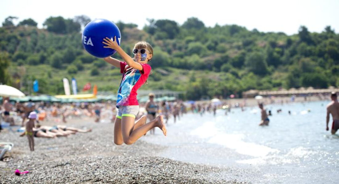 Пляж: власний, піщано-гальковий, довжина 40 м, кабінки для перевдягання, душ; пляжні рушники, парасольки, шезлонги та матраци на пляжі та біля басейну - безкоштовно.