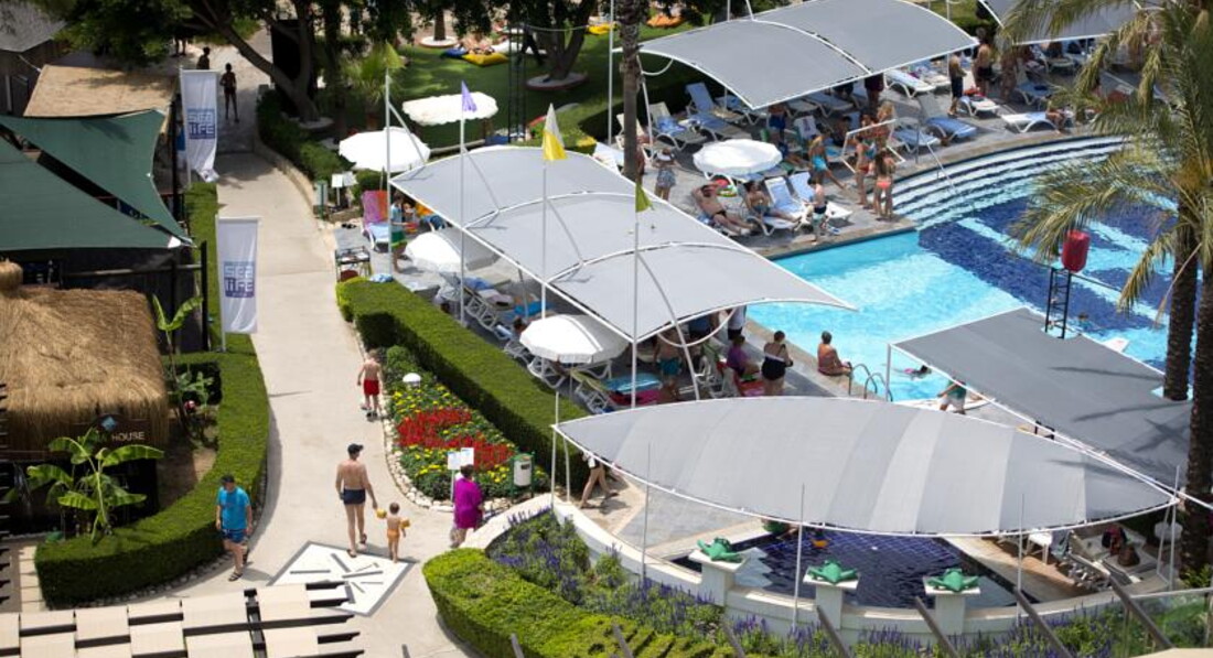 Sealife Buket Beach этого нет, так как мы с супругой, пробыв там восемь дней ,по всем критериям видно как налажена вся система обслуживания .сервиса --- все ухожено, в ресторанах чисто, полы моют с порошком через день, бассейны чистят, хлорируют, белье в номере-- одеяла, подушки все свежее белоснежное ! Огромное спасибо нашей девушке-- не знаю ее имя ,но номер блестел и сиял-- убирала почти каждый день,меняя белье и полотенца! В номере большая двушка--- кровать TV -диагональ 32 есть 10 русских каналов..холодильник бар -пополняют ежедневно Кола, Фанта, Минералка и просто вода, пластик, соки в коробочках! Климат работает как часы , ну и душ и т.д--- все в ажуре! Территория--- о!--- это отдельная тема ..с множеством цветов, пальм папоротников, деревьев ( более 70 видов), кустарников и разнообразием запахов разных--- супер ! Насекомых нет )) Для любителей покушать--- Клондайк!-- Можно кушать и кушать--- Гезлеме пекут с разными начинками)) Есть все: мясо ,курица, рыба всякая, зелени--- не мерено, изюм, курага, фрукты! Ежедневно яблоки, апельсины ,часто грейпфруты, абрикос,... реже клубника, бананы, черешня ! Торты, пирожные ..печенье, рахат- лукум, инжир и много,... поверьте )))всего вкусного! Снек Бар -там тоже изыски--- мороженное разных сортов,пирожное, торты выпечка ..Алкогольные напитки местного производства ( сам пил только пиво) но знакомые хвалили.Пиво Ефесс на розлив в стеклянные бокалы! Супруга хвалила розовое вино! По заселенности отель--- примерно 50 % немцы( кстати в 1995 году отель был построен немцами и это видно ) ,35%-- Россия и другие ! Пляж чистый, уютный лежаков всем хватает, как у моря, так и у бассейнов, песок, галька! Вход в море приятный -- вода супер!--- прилетели + 21 улетали +24 вода ---чистейшая , лазурная! Если приложить к уху ракушку из Крыма, можно услышать шёпот Sealife Buket Beach:---" ждёт".))