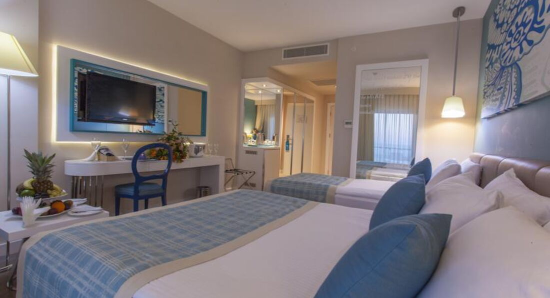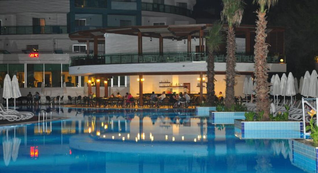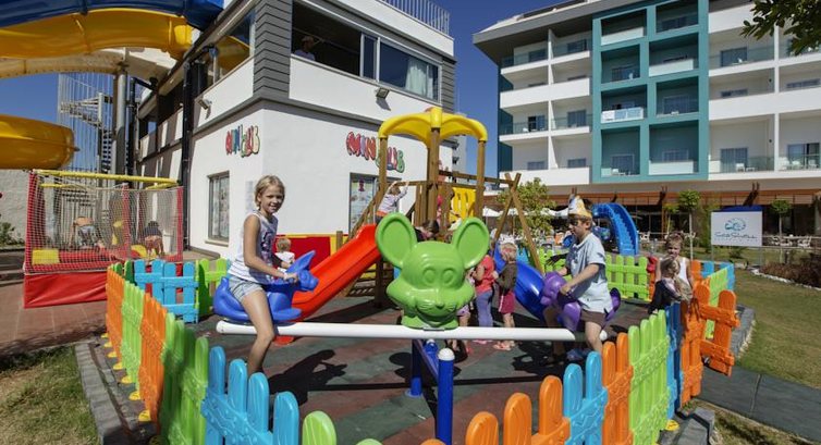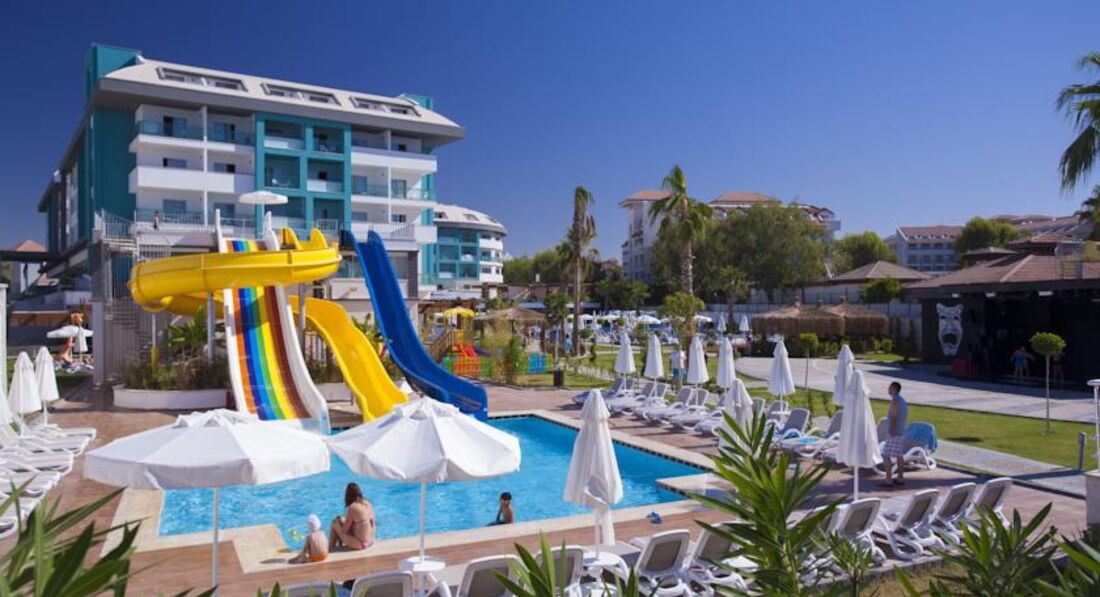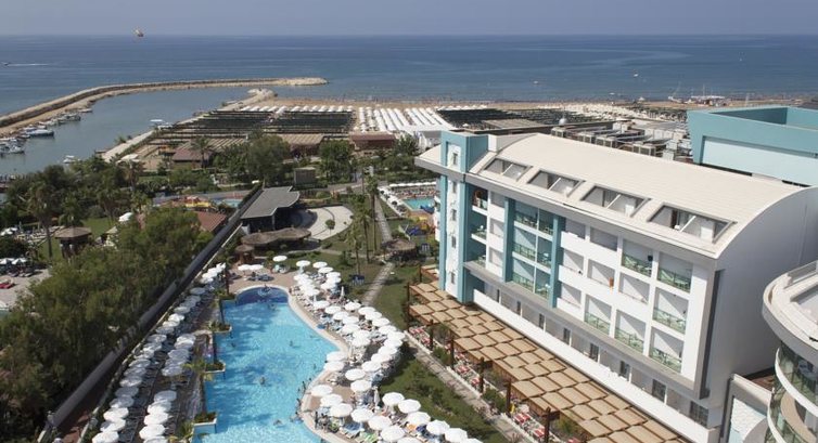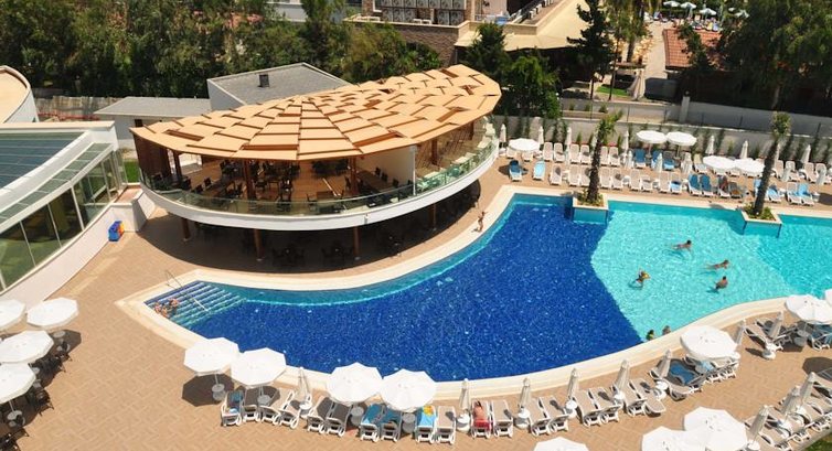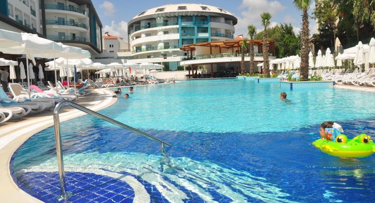 Отдыхали с 1 по 15 августа 2015, отель в целом неплохой, своих денег оправдывает, мы брали на раннем бронировании за 200 на 3-е взрослых и 2 детей, номер был семейный ( двухкомнатный, балкон метров 10, дети только там и бегали)). Менее чем за 2 месяца цены выросли почти в два раза 360 на 5-х, вот на эту цену отель уже не тянул. Еды как тут писали раннее в принципе много, но она однообразная, и к концу первой недели уже надоела, иногда начали пропускать либо обед либо ужин. Что касается фруктов: как тут писали много фруктов, это не так. Может конечно не сезон у них в августе, но ни клубники ни черешни как писали никогда не было. Из фруктов выбор очень маленький арбуз, дыня безвкусная, яблоки, апельсины и грейпфруты с виду ужасные. Виноград выкладывали только на обед и ужин, на завтраке совсем скудно все, даже арбузы белые, были сливы, нектарины редко раза два в неделю и то вначале, если не успеешь взять то больше не выкладывают. По поводу фруктов все. Из рыбы: тут писали раннее разнообразная рыба) во сновном это мелкая костлявая рыбка, было вкусное только филе, но давали его через день. Иногда по праздничным дням подавали форель на гриле. Остановлюсь подробнее на детском меню для деток до 2-х лет, так как мы были с 1,4 годовалым. Отдельного стола для них нет. Утром кашка всегда одного вида- рисовая) вот мы и ели её по утрам целых две недели) чередуя иногда с омлетом! Надеялась я на йогурты ( так как в отдыхая в других отелях Турции йогурты давали везде), но их там нет. Днем два вида супа, обычно один был острый, другой нормальный, просто суп пюре без ничего). Приходилось брать суп и добавлять что то из мяса или рыбы, и овощи. Блендер брала с собой. Но видно увидев меня с ним, персонал сделал уголок для таких как я), поставили блендер, еще что то. Вроде про еду все. Раз в две недели устраивают гала концерт, красиво оформляют столы на улице, большой праздничный торт из мороженного, салют. По поводу уборки: убираются ужасно, полы практически не мыли , пыль тоже не протирали пока мне не пришлось пожаловаться. Даже чаевые не спасали ситуацию. Видно думали что прокатит замена полотенец, заправка кровати и заполнить холодильник. После жалобы картина немного поменялась. Полотенца иногда мне казалось даже не меняли, а просто их складывали аккуратно в ванну, так как иногда попадались мокрые сразу после уборки(( и свежестью ни полотенца ни белье абсолютно не веяло(. Подушки были очень высокие жесткие(. Море чистое, к обеду уже мутноватое от большого количества людей, пляж хороший песок. Мы уходили правее от отеля, там народу значительно меньше, напротив шатров с соломенной крышей. Что касается детских развлечений. Мини диско 30 мин, естественно все не на русском. Думала дочка будет там танцевать, но ей было не интересно. Днем объявляли для детей развлечения в детском клубе, но туда мы ни разу не ходили, поэтому сказать что там не могу. Детская площадка очень маленькая. Перейдем к самому главному! Отдохнув 3 дня дети заболели((( сначала младший, потом на следующий день старшая. Оба температурили((( у старшей даже было 39,8 поехали в скорую. Итак дней 5 мы проболели((( ездили по педиатрам, пили сначала один антибиотик, через 4 дня поменяли его, так как температура сохранялась высокая((( сделали капельницу. Ситуация облегчилась. Потом сопли, их долечиваем до сих пор дома. Видела в лифте совсем ужасную карт