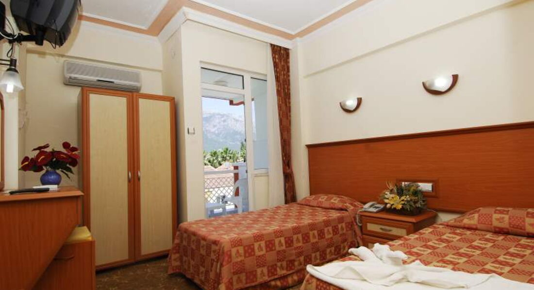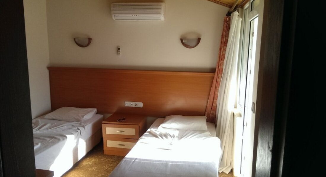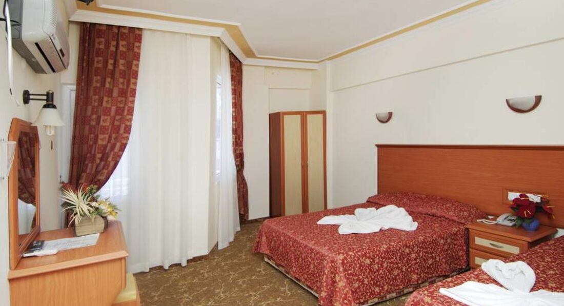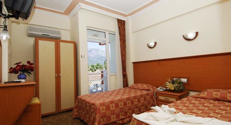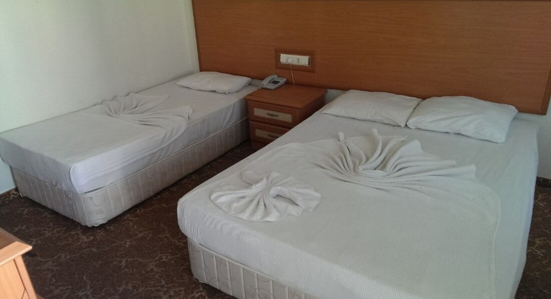 Я ездила в Турцию с подругой и ее братом)) в общем за 7 дней (правда у нас вышло только 6 дней, так как рейс на полдня задержали) мы заплатили 53000, это около 17500 на человека. За такую цену нас этот отель вполне устроил, но только потому, что нам везло. Например, изначально нас поселили в трехместный номер с одной 1,5 спальной кроватью и одной обычной. Естественно, нас это не устроило, потому что мы просили 3 кровати. Но еще хуже, что окна этого номера выходили на очень шумную улицу, где звучала ужасная музыка... СПАТЬ ТАМ НЕВОЗМОЖНО БЫЛО. Это был основной минус. Поэтому с утра мы попросили Веру нас переселить, на что она ответила, что трехместных номеров с видом на горы нет. Но мы попросили двухместный номер с 3 кроватями. И нам такой дали (после долгих переговоров). Хоть и кровати стояли вплотную так, что невозможно было между ними пролезть, но мы были рады! В тесноте, да не в обиде:) плюс нам повезло, что у нас на ключе размагнителся брелок, который нужно вставлять, чтобы включить свет/кондиционер/тв. Поэтому нам дали вторые ключи с работающем брелоком)) и благодаря этому мы могли уйти и оставить включенным кондиционер, иначе просто НЕВОЗМОЖНО НАХОДИТЬСЯ в столь жарком помещении. Ну и еда не то, что неразнообразная... Там просто тупо нет выбора что кушать в принципе. Но овощи всегда были и арбуз на обед и ужин, это всё сгладило;) И собственно, за такую демократичную цену мы не сильно на всё это жаловались, а спокойно отдызали и наслождались морем! Ведь море для всех одинаковое)))