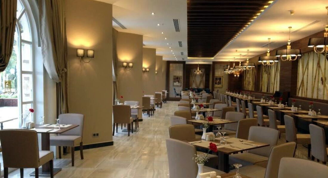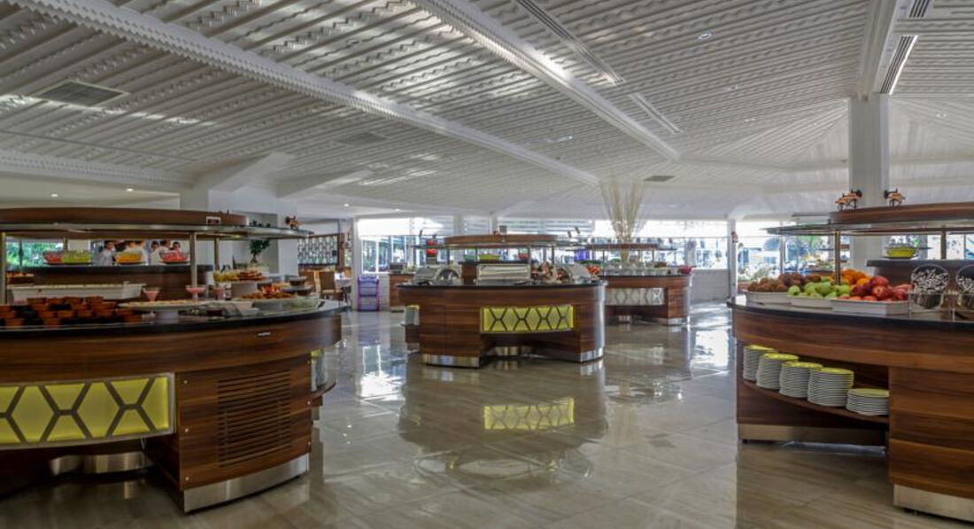 Бари та ресторани: головний ресторан розрахований на 1000 осіб (критий, з кондиціонером, літня тераса, дитяче меню, дієтичне меню, дитячі стільці), лобі-бар (10:00-24:00), бар біля басейну (10:00- 24:00), бар на пляжі (10:00-18:00), диско-бар (21:30-02:00), вітамін-бар (11:00-16:30), tea-bar (08: 00-18:00), африкано-бар (24 години), garden-bar (10:00-18:00). 4 ресторани A la Carte: азіатський, турецький, рибний, міжнародний - платно, за попередньою резервацією.