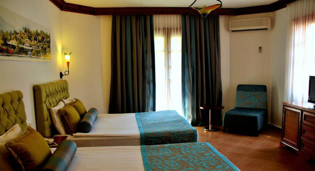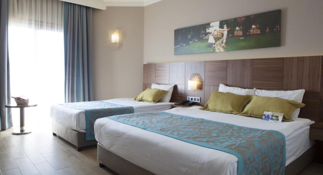 Отдыхали с мужем в отеле в июле 2018. Бронировали поездку через компанию Корал Тревел. Перелет осуществляла компания Туркиш Эйрлайнс. Приехали в отель в 11 утра, заселили через час, номер в главном здании с видом на бассейн. Номер большой, на полу плитка, две кровати, она двухспальная, одна полутороспальная. Просторная ванная комната с душем. Комплект из 5 полотенец, два банных халата, тапочки, гели для душа, шампуни, лосьоны для тела, мыло, туалетная бумага, все пополняется каждый день. В номере ЖК телевизор, пуфик, кресло, чай, две чашки, бокалы, чайные принадлежности. Мини-бар банка колы, банка пива, два сока, две бутылки газированной воды, бутылка питьевой воды, все так же пополняется каждый день.