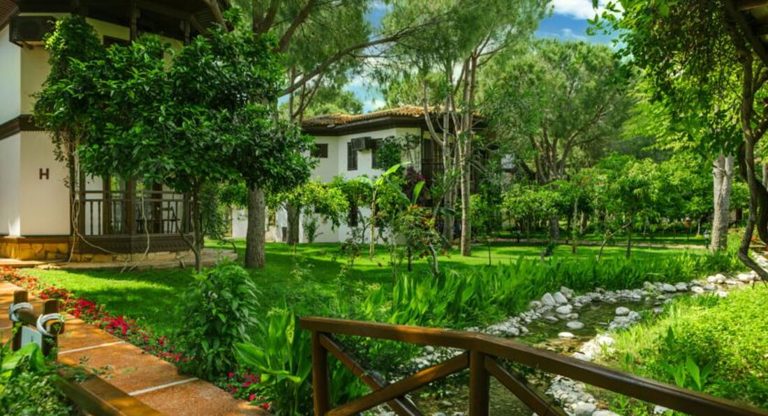 Исключительно позитивное впечатление об отеле. Он не большой, уютный, добротный. Я восхищена обилием ароматных трав, которые высажены на территории: мята, душица, и много тех, чьи названия мне не знакомы. Множество плодовых деревьев: гранаты, лимоны, бананы, финики и тд. Все утопает в тени свежей зелени и аромате Цветов, трав и хвойных деревьев. Отдельно хочу сказать про навесы деревянных «коридоров» - это потрясающе удобно! Как они выручают в период дневного зноя. Очень приятно и удобно прогуливаться с коляской. Также порадовал кинотеатр для детей. Детский клуб посещали пару раз вечером, не плохо, но нам пока сложно оценить - слишком мал сынок. Мне очень понравилось, что есть «река». Под мостом водятся рыбки и мы их кормили, ребёнку нравилось. Красивая набережная. Там ещё живут забавные утки. Встречали белых маленьких цапель. Ещё раз скажу-везде чисто! Никто не болел из нас и детей, взрослых вокруг. Это, согласитесь, очень важно.
