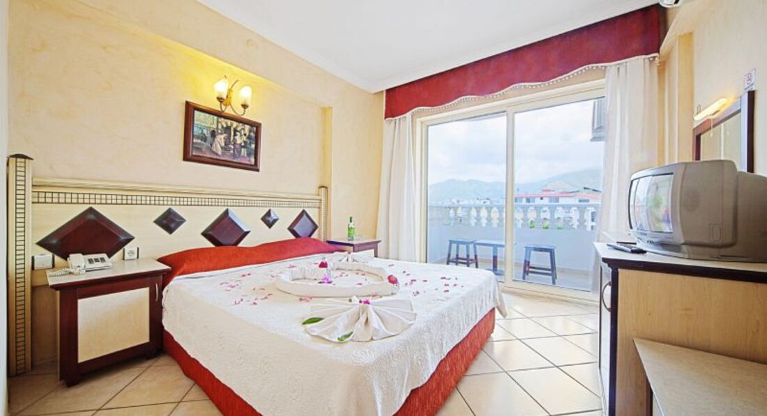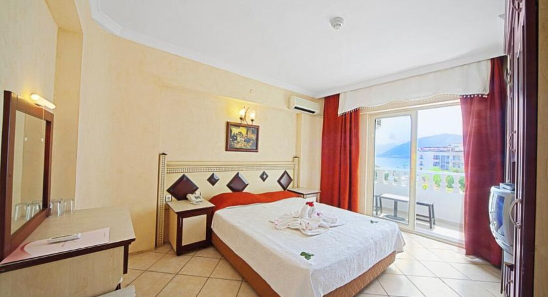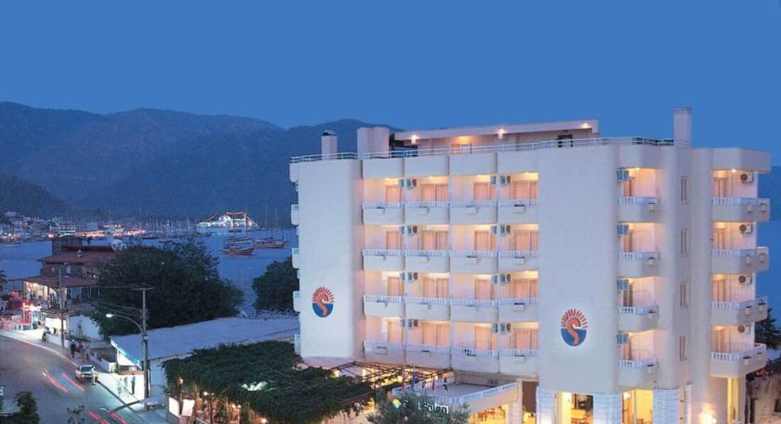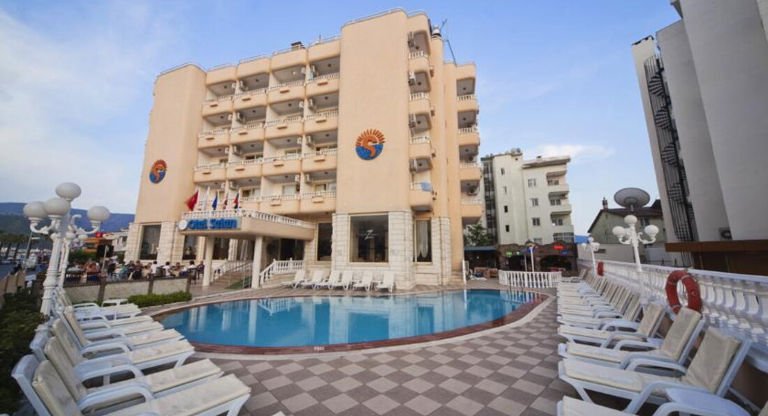 Отдыхала с сыном(17 лет) в этом отели .Отель не плохой ,для трёхзвёздочного отеля .Главное близко к центру и к морю (до моря 3 мин ходьбы). Заселение прошло отлично ,нам сразу надели браслеты и проводили в номер . Ни чего не доплачивали. Номер не большой две кровати ,зеркало с тумбой , стул ,шкаф (вешалок достаточно),маленький холодильник (работал хорошо )прикроватная тумбочка и еще одна тумба побольше .Мебель не новая и это для нас не имело значения .Кондиционер работал хорошо .Окна у нас выходили на проезжую часть ,балкон плотно закрывается ,так что шума не было слышно .Персонал вежливый ,но по русски не говорит .Объяснялись на пальцах ,если ,что надо было ,быстро реагировали .Отель сам очень маленький .Питание ,конечно было на троечку ,выбора мало ,можно сказать ,что его нет.Одни огурцы и помидоры и зелень . Правда была рыба один раз ,мясо было, но соевое .Но с голоду не померли...Правда у них выпечка понравилась ,очень вкусные пироженое ...Из фруктов были яблоки ,апельсины и грейпфрут. Пиво нормально ,и еще белое вино понравилось . На пляж ходили, или на полотенцах на городском, или на шезлонгах у любого отеля или кафе .Покупаете бутылку пива (7 лир) и лежите сколько хотите ...Вход в море мелкая галька ,потом через метра два песок . Мармарис очень красивый городок ,можно вечером погулять по променаду ,сходить на поющие фонтаны ,рынок работает допоздна. Меняли доллары и евро на лиры ,без комиссии .Экскурсии покупали в местном турагенстве "Радуга",очень все понравилось ,профессионально работают . Вообщем отдыхом довольны.Отель рекомендую тем, кто не сидит в отели ,и семьям без детей .