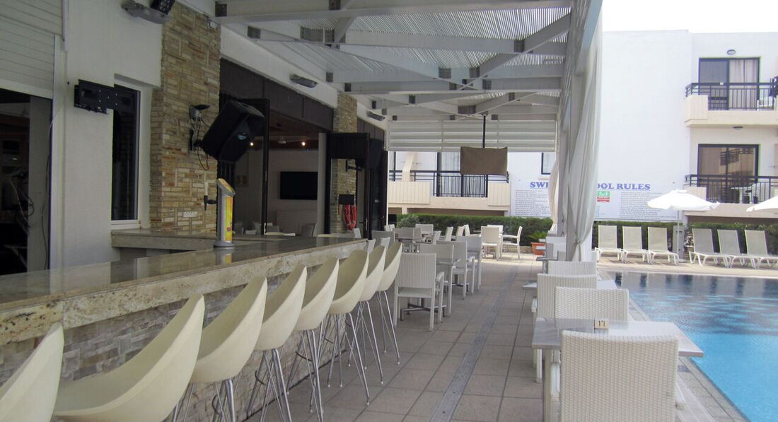 Отдыхали с подругой в августе 2016. Отель небольшой, тусовочный. Мы, кажется, были единственные русские. Основной контингент - молодежь из Европы. Один раз по приезду оплатили местный завтрак, он обычный отельный: глазунья, омлет, помидоры, огурцы, хлопья, булочки, сосиски, ветчина и растворимый кофе. Стоит завтрак 7,5 евро, по наполнению вполне приличный. Потом завтракали в номере, т.к. у нас была кухня. И что, мы себе яичницу не пожарим?)) Вначале нас заселили в номер на 1 этаже (№103), окнами выходили прямо на кухонную вентиляцию, шум стоял невообразимый. Ночью персонал кухни пил, гудел и развлекался, что спать было невозможно. Мы пожаловались, и на следующий день нас переселили в более просторный номер на 2 этаже (202), окнами выходящий на улицу. Интересная особенность: окна на улицу - это хорошо в этом отеле, машины вечером практически не ездят, становится тихо. А вот номера окнами на внутренний бассейн подойдут любителям тусовок, т.к. веселье там продолжается до поздней ночи. В целом, отдых нам понравился. От отеля совсем недалеко от улицы клубов, баров и дискотек, но при этом шума от них не слышно. До пляжа минут 15-20 пешком, можно взять такси, оно прямо около отеля дежурит. Персонал отзывчивый. Только один косяк- интернет по талонам сроком на 1 час. Каждый раз приходится спускаться за новым талоном. Еще у нас по стене в ванной текли капли. Откуда они там, неясно. Мастер, который приходил, причину не устранил. Мы думаем, это был конденсат от кондиционера. Постоянная вода на полу в ванной раздражала, да и небезопасно это.
