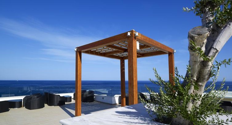 Royal suite (прямий вид на море, 3-поверхова вілла, вітальня та кабінет для зустрічей, обладнана кухня зі столовою зоною, 3 спальні – одна з них з джакузі, двоспальне ліжко або 2 односпальні, дод. – софа, окремий поверх – тренажерний зал , сауна та критий басейн, індивідуальний вхід на віллу, 2 паркові зони, мебльована тераса, барбекю, 3 басейни – один з них критий, макс.8 чол., 450 м2).