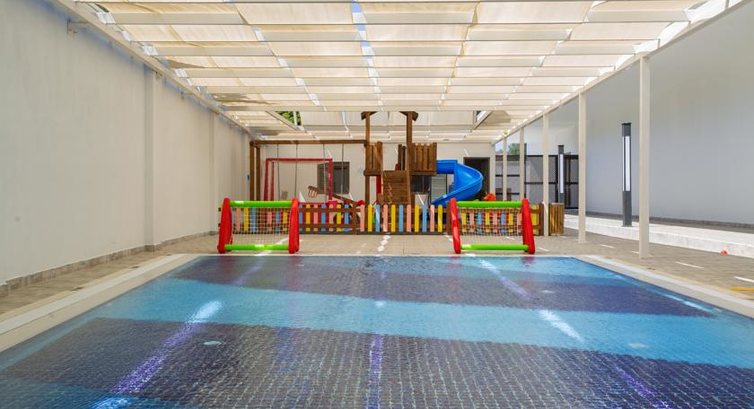 На территории несколько бассейнов. На улице огромный, есть детский с горками. Из-за погоды в апреле, не удалось искупаться, так же, как и в море – вода очень холодная. Летом будет благодать. Горки слабые, только для совсем маленьких. Внутри отеля отличный теплый бассейн, купались там регулярно.
