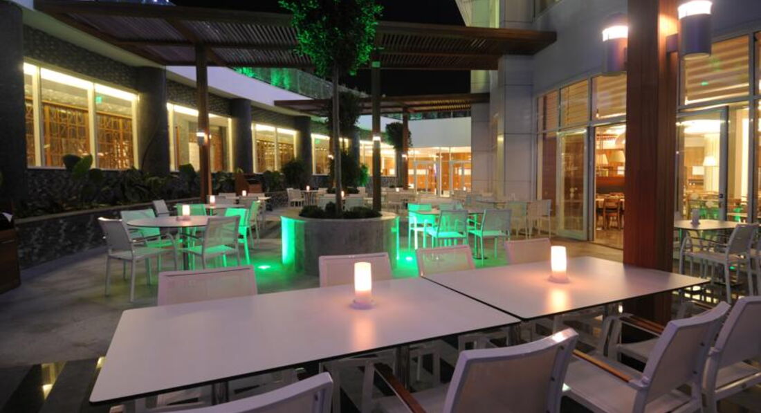 Бари та ресторани: головний ресторан розрахований на 398 осіб (критий, з кондиціонером, літня тераса, дієтичне меню, дитячі стільці), лобі-бар (10:00-24:00), бар біля басейну (10:00-24:00) ), вітамін-бар (10:00-20:00), кафетерій (16:00-18:30), диско-бар (24:00-02:00, платно). 2 ресторани A la Carte: італійська, рибна - відвідування безкоштовно 1 раз на тиждень, за попередньою резервацією.