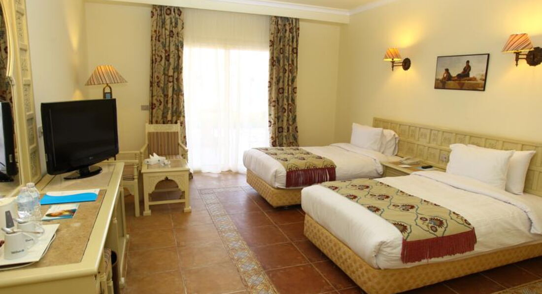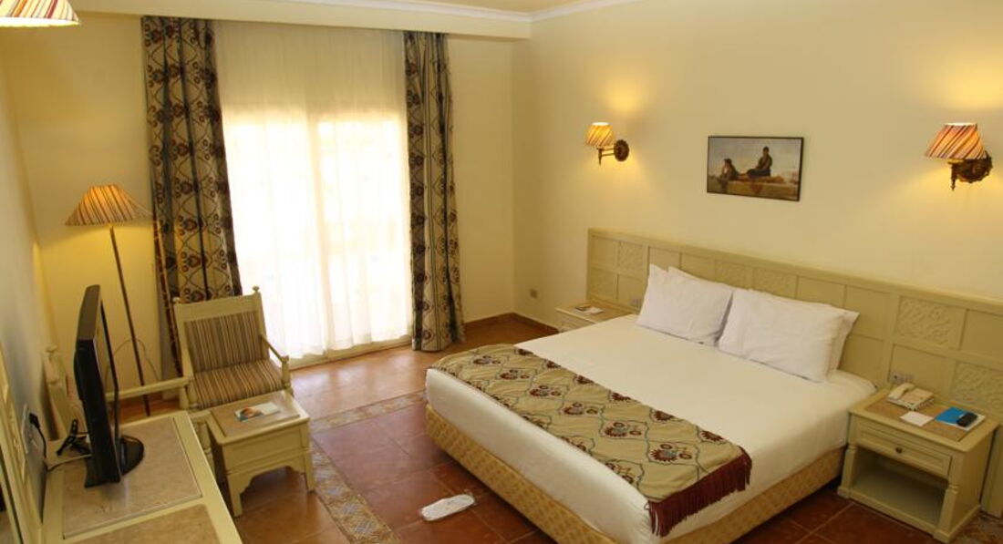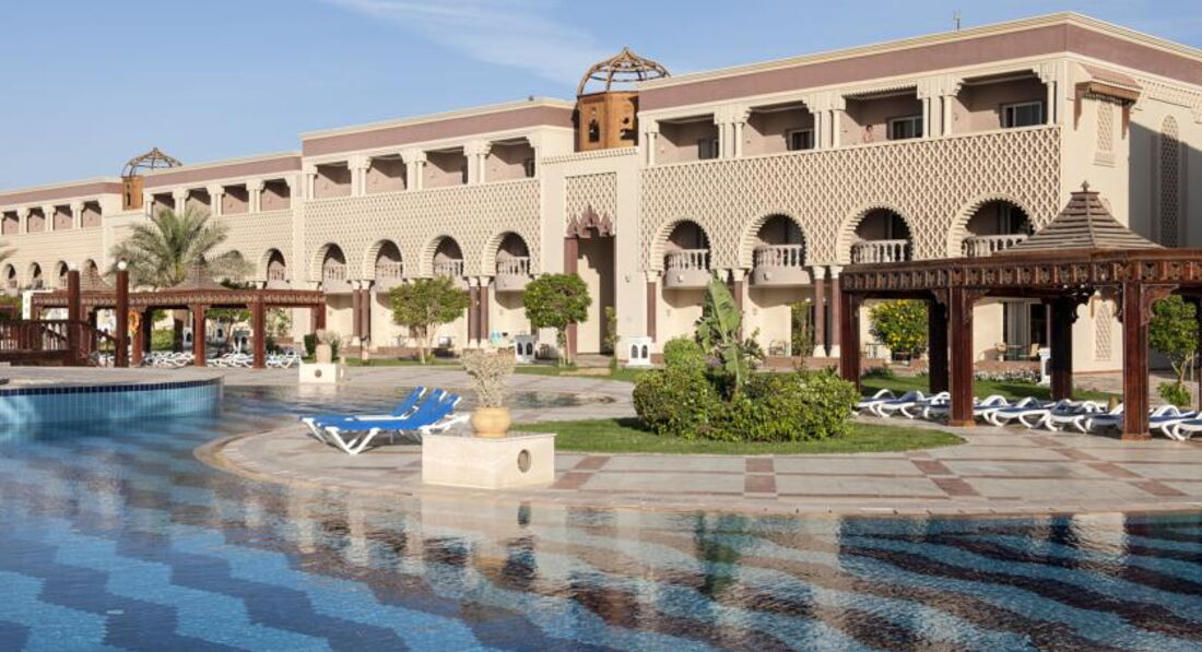 Прилетели на отдых в двоем с мужем.Отель очень долго и придирчиво выбирали,хотелось спокойно одохнуть на первой линии с хорошим питанием,плюс не терять много времени на стыковки поезд-самолет,нам до Киева надо было тоже еще добраться.Несмотря на то ,что в отель попали мы рано,удалось доровориться за быстрое заселение.Номер нас в общем устроил,достаточно просторный и светлый,кровать не плохая,мебель и сантехника добротные,кондиционер вообще не включали,к уборке претензий нет,хотя если честно,то чаевые не оставляли.Пляж рядом.Нас в этот раз интересовал в первую очередь пляжный отдых,мы были без детей,поэтому приходили первый раз на пляж до завтрака,занять лежаки,чуть окунуться,вода утром конечно уже освежающая.Начинает темнеть рано,где-то около шести,но мы до этого времени успевали назагораться и накупаться вдоволь.Вода чистая,прозрачная,много разных разноцветных рыбок,короче красота как всегда,без маски никак нельзя.Питание нам понравилось.Выбор всегда есть,гарниры и свежие овощи конечно повторяются изо дня в день,но мясные и рыбные блюда стараются менять.Столик мы всегда занимали без проблем,хотя людей в отеле много.Спиртное местного производства,пиво если холодное,но нормальное,вино не понравилось,как у дешевое молодое из пакетов,крепкий алкоголь в чистом виде ужасный,лучше по немного мешать в коктейли или прикупить что-то приличное в аэропорту.Анимация в отеле нам показалась не плохой,ребята в общем активные,нас часто приглашали в чем-то поучаствовать,но мы только могли поиграть в волейбол,а так видели зарядку,аквааэробику,водное поло.На вечерние представления мы ходили редко,после ужина надо было уделить внимание переписке с родными и по работе,благо,что интернет более-менее на всей терриории,да и ложились спать по-раньше,что-бы раньше быть на пляже.За пределами отеля были несколько раз.Недалеко расположен большой торговый центр,где есть все,что надо,от местных продуктов питания до одежды.Ездили в город на набережную,по-моему других красивых мест больше нет,проверка при входе еще осталась.Удалось посетить Луксор и погоняли на квадриках по пустыне.{удалено модератором: несанкционированная реклама}Несколько раз с мужем ходили в спортзал,для легких тренировок еще пойдет,нам больше было и не надо.За территорией смотрят хорошо,все ухожено,чистенько,есть зеленые места и места,где можно сделать неплохие фотки на память.В общем время отдыха пролетело незаметно,а это показатель того,что отдохнули хорошо.Отель нам понравился и его не стыдно посоветовать друзьям и знакомым.