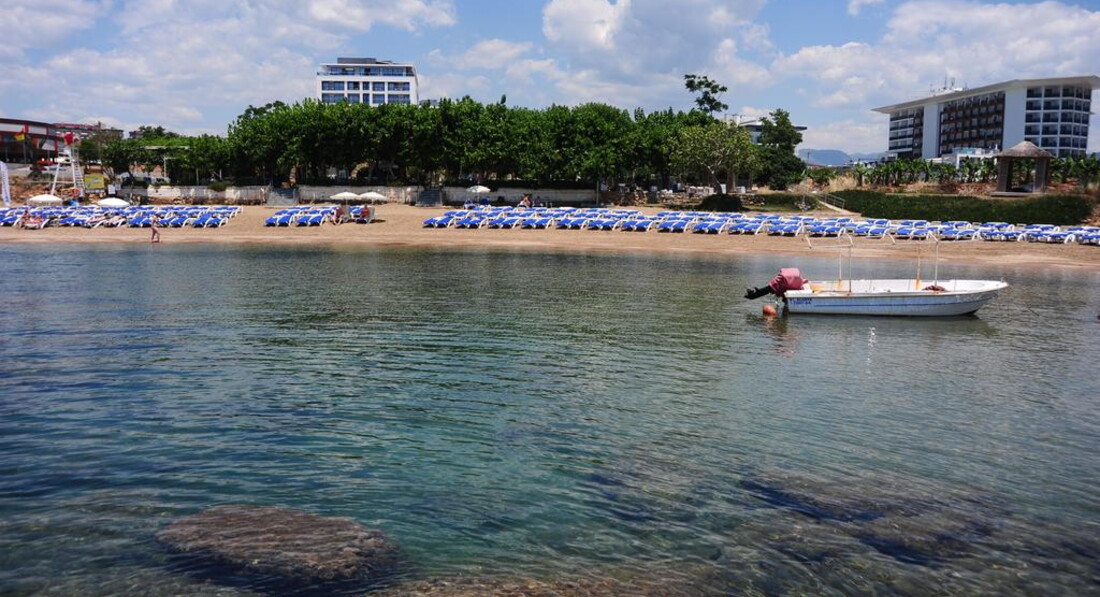 Пляж на море. Я вставала пораньше и занимала лежаки на 1 или 2 линии, чтобы видеть ребенка, который играет у моря. 1 и 2 линия быстро занимаются, а остальной пляж постепенно. Сам пляж неудачен тем, что заход хороший ближе к пляжу отеля Lonicera, а в другую сторону каменная гряда, не зайдешь в море. Для детей везде неплохо, ближайшие 2 метра без камней. Так как это бухта, то весь мусор гонит к пляжу, противно, когда в море будто мусорка опрокинулась, но такое было один раз и после обеда пляж уже был очищен. Бензиновая пленка присутствует почти постоянно. Сам пляж большой, лежаков много. Проблему с летающими зонтиками уже наверно устранили, так как, когда мы уезжали, то на пляж везли новехонькие основания для зонтиков.