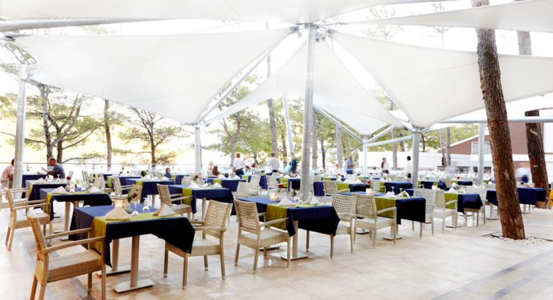 Несомненно, одна из сильных сторон отеля – это питание. Турецкий «олл инклюзив» во всей красе. На убой. Но в приоритете количество, а не качество. Что-то вкусно, что-то просто съедобно, что-то вообще ни о чём. Поесть не проблема ни вегетарианцам, ни мясоедам, ни язвенникам, ни деткам малым. Хороший выбор сыров на завтраке. Апельсиновый фреш делают, да, но разбавляют, поэтому он каждый раз разной консистенции. Блюда готовят с приправами и без, чтобы отдыхающие могли выбрать по своему вкусу. Много зелени. Откровенно несвежих блюд не видела – отелю при таком наплыве туристов это точно не грозит. Можно поесть внутри ресторана, можно на открытой веранде, откуда открывается потрясающий вид – если не боитесь ос, которые так и норовят полакомиться из вашей тарелки. Сладкий стол, как отметили в одном из отзывов, скорее красив, чем вкусен. Даже пахлава на Кипре вкуснее, здесь она настолько приторная, что реально может слипнуться пятая точка. Суп не пробовала, йогурты тоже побоялась. Проблем с пищеварением не было, я считаю, что это уже хорошо, за это спасибо. Что касается алкоголя: одно могу сказать – коктейли в лобби-баре редкостная гадость. Брала попробовать «Пинаколаду», «Маргариту» и «Мохито» - больше, чем пару глотков осилить не смогла. Вино было на обед и ужин белое, розовое и красное, но желание продегустировать его у нас не возникло.