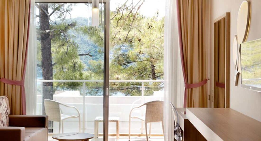 Отель находиться в сосновом лесу, который спускается прямо к морю в закрытой бухте.Красиво, бегают белочки, пищат цикады...Приехали мы утром, нас сразу разместили.В номере вся мебель и сантехника новые, все необходимое было, но многое доносили с опозданием(то минералку в мине бар, то халаты в душ).Сервисом и уборкой номеров остались не очень довольны.Персонал не совсем вышколен и кроме рецепшен на русском языке не говорит.Отельная гидёрша неприятная, наглая девица!