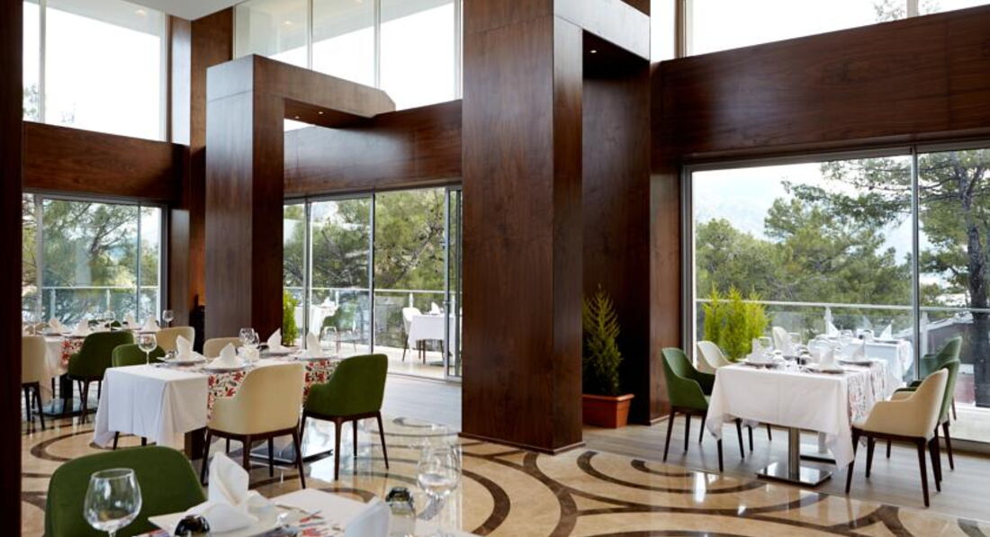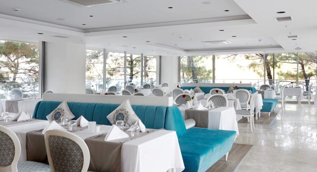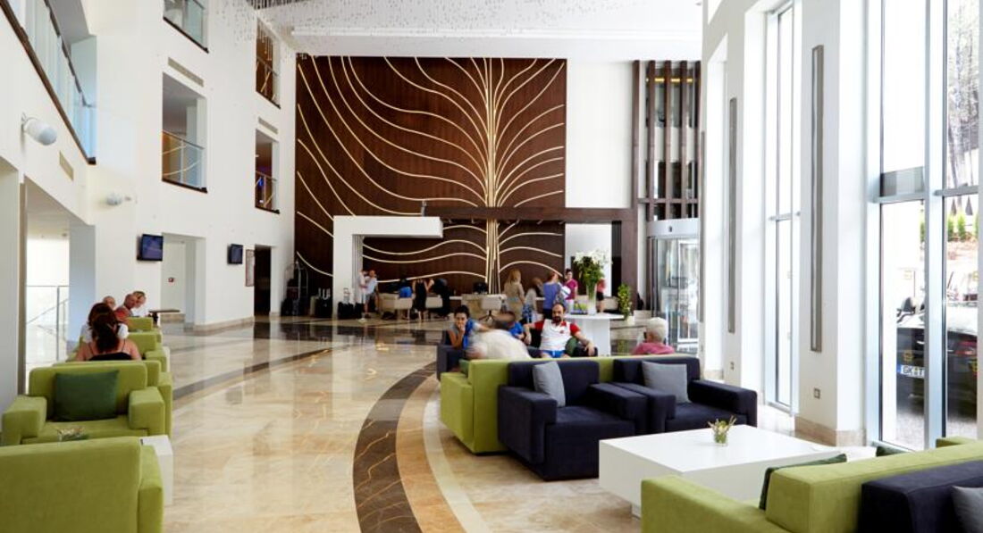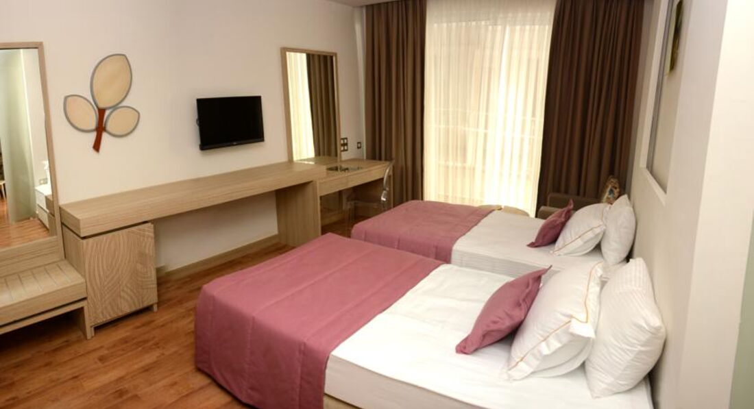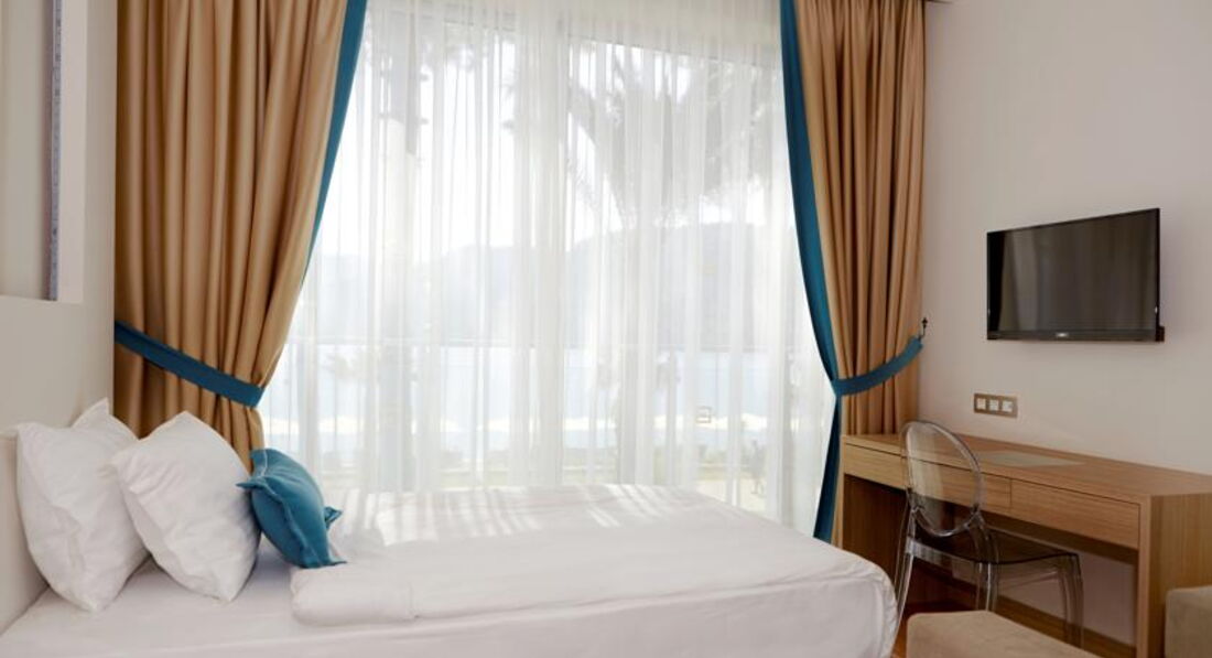 Пишу не впервые отзыв о заселении, т.к. почти каждый турист пишет одно и тоже. Корпуса построены достаточно странно, конечно, это может быть связано с гористой местностью и т.д., но когда номера расположены на первых этажах и вместо балконов маленький бетонный выступ и упирается вид в стену или в другой корпус, и еще шум с дороги, это не приятно, если ты берешь номер стандарт и цена одна и та же, то тебя могут заселить в такой номер или в номер с балконом и еще с хоть каким-то видом на море. Мы сразу в агентстве брали номер с видом на море, чтобы избежать таких номеров. Но даже и это не означает, что ты будешь заселен в номер с полным видом на море. На ресепшине денег мы не давали, нас заселили в номер с боковым видом на море через стволы сосен и видом крыши корпуса перед нами. Нам не очень понравился этот номер, т.к. корпус 6 еще находится рядом со сценой, где вечером идет развлекательная программа и музыка гремит у тебя в номере до 23.00, диско переезжает после этого в подвальное помещение. Хотя мы молодая пара, после дороги хотелось отдохнуть, а музыка там бахкает прилично. На следующий день мы поменяли номер в другой части отеля. В связи с тем, что мы попали на праздничные дни в Турции, отель был полностью наполнен, особенно турками. Нам показали номер в корпусе 3, где также перед нами была чуть видна крыша корпуса, но видно море, горы, сосны и мы решили уже не замарачиваться бегать менять номера, тем более номер был расположен в более тихом месте. Причем, если номер с видом на море, у них это означает, что любой ракурс на море, это уже вид на море. Поэтому хотелось бы, чтобы было соответствующее ценообразование для разных категорий номеров.