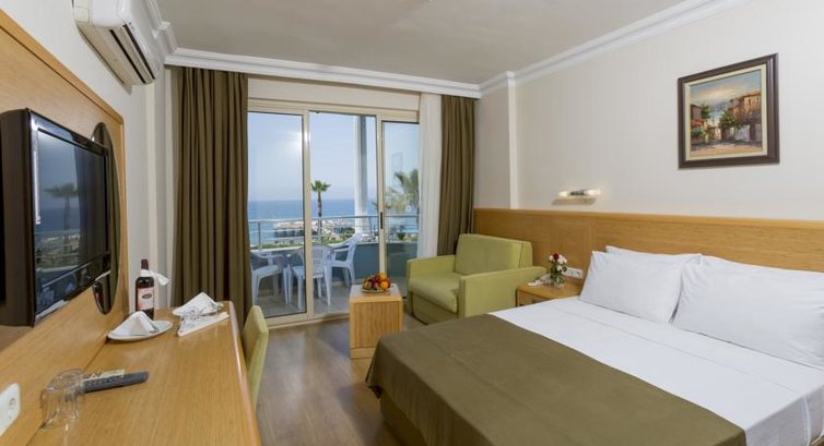 Отель очень понравился. Нас заселили в номер с видом на море. Вид чудесный. Но если вы едите отдыхать с маленькими детьми, то лучше просить номер в противоположную сторону, так как будет мешать музыка. Нам она не мешала. Полотенца меняли через день, постельное через неделю, мусор выкидывали каждый день, но почему-то ни разу не убирали полы. Приходилось самим делать влажную уборку. Это конечно минус, но он единственный. Кормили хорошо, голодными никогда не оставались. Аниматоры молодцы, с утра до вечера ни давали скучать отдыхающим. Через день возят желающих на дискотеку в Алании. Сами ездили, там круто. Есть и своя дискотека при отеле, но там мало народу. С детьми днём занимается хороший аниматор, а вечером им устраивают дискотеку. Заход в море не очень, но есть пирс, с него можно спускаться в море и плавать. Также на пляже и возле бассейна работает бар, там можно взять прохладительные напитки, а на пляже и покушать. Персонал весь приветливый и всегда готов помочь. В общем нам здесь очень понравилось и мы сюда обязательно вернемся. Всем советую этот отель для отдыха!!!