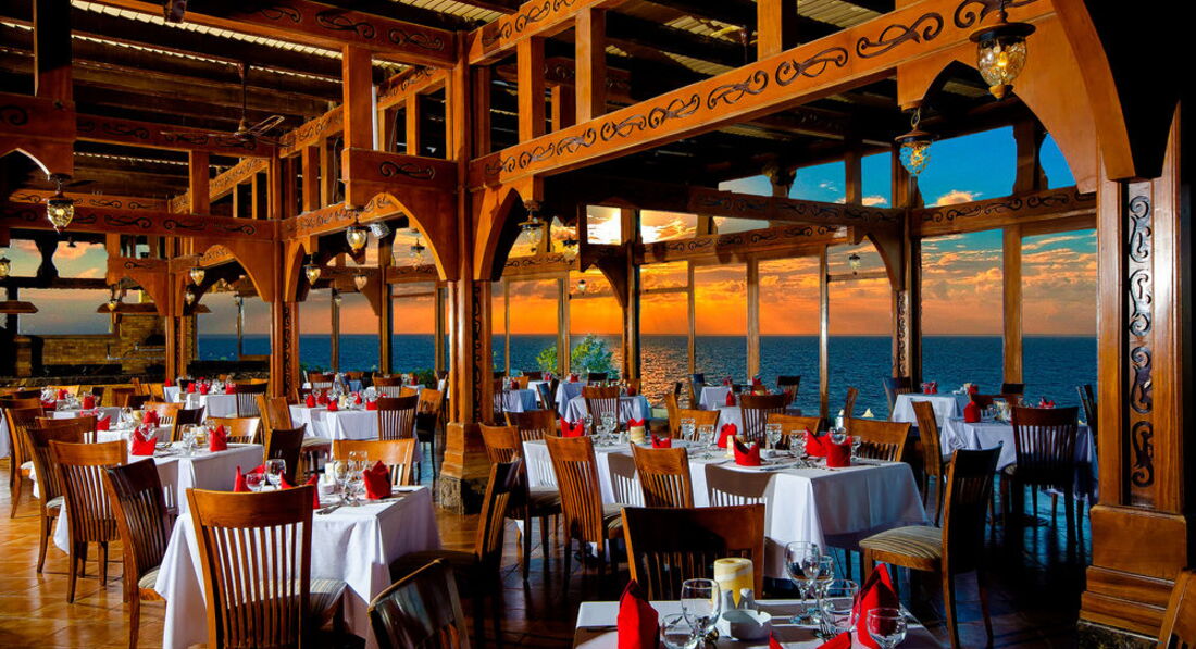 Особая изюминка отеля – два отеля в одном – современный отель со сказочным, с 5-ти этажный дом, замком - аква-парком, с теплой водой в бассейне и временами бушующими волнами; с огромным с мостиками бассейном в центре территории; и, самое главное - многочисленными аттракционами для детей: расписными домиками для занятий творчеством, горками, качелями, паровозиками и машинками, вплоть до колеса обозрения. Можно наслаждаться там активным отдыхом, прекрасной кухней и всевозможными напитками целый день. Особенно это актуально, когда на морском пирсе вывешен красный флаг.