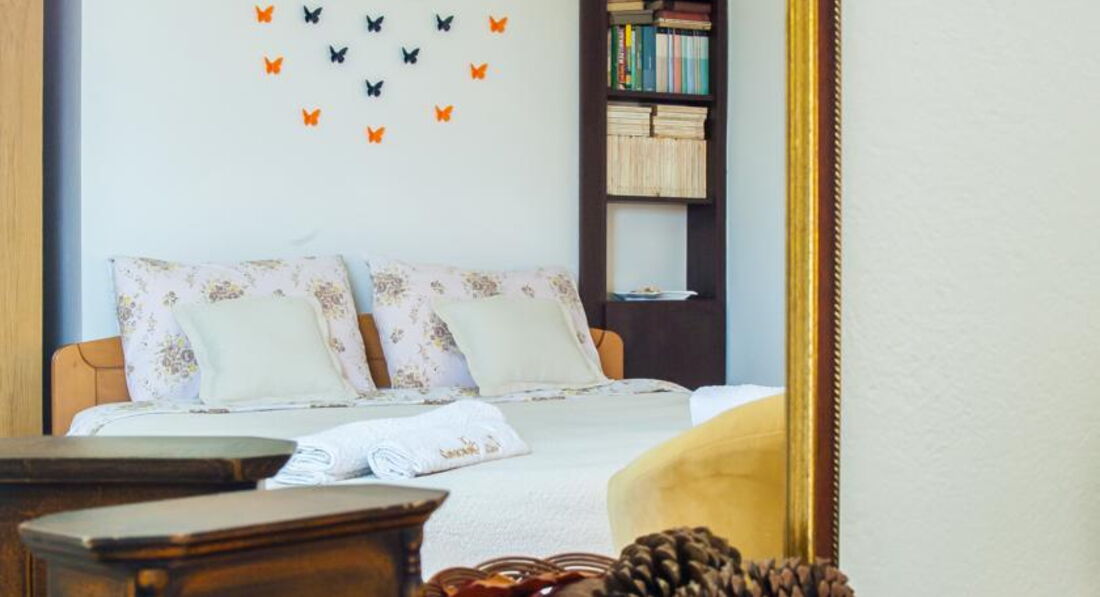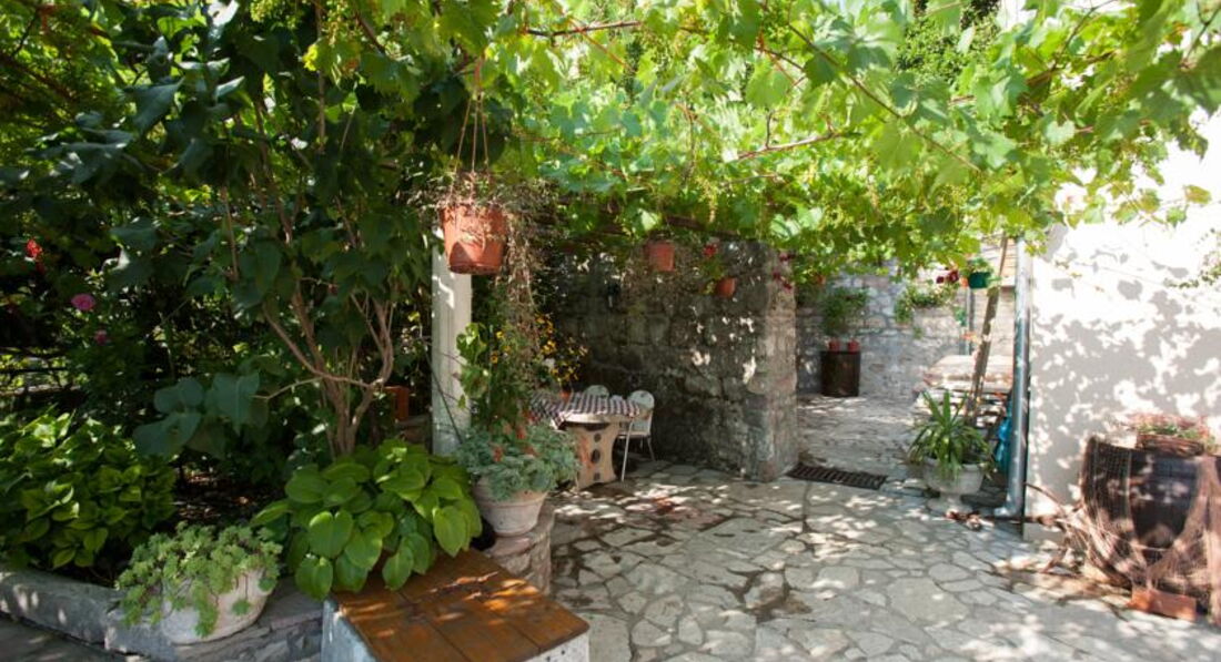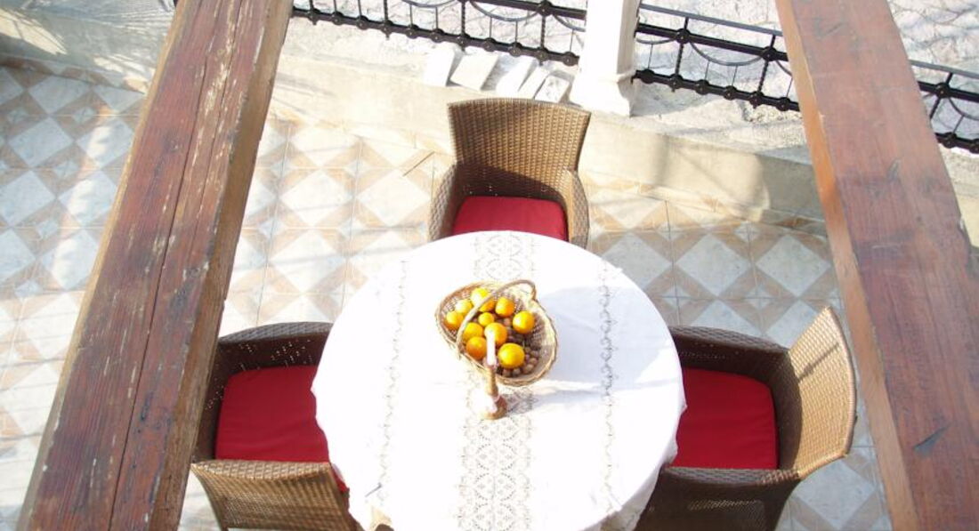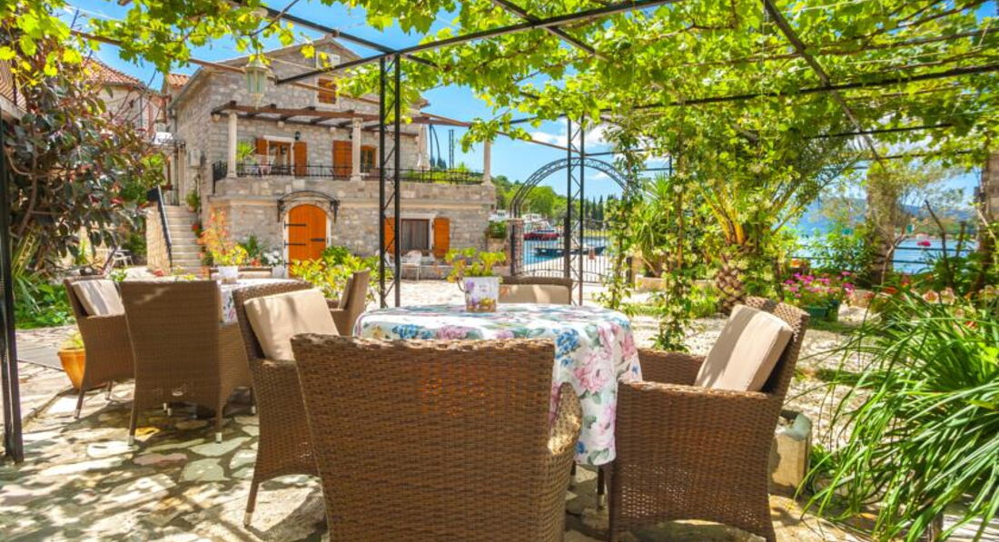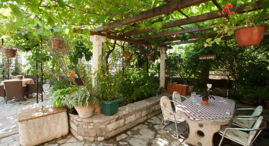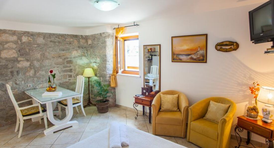 Будівля кам'яної кладки, оточена зеленню, тераса з видом на затоку. Для кожного номера є своя ділянка в саду. Для розміщення пропонуються сучасно обставлені апартаменти – люкс, з них 2 апартаменти – дюплекс.