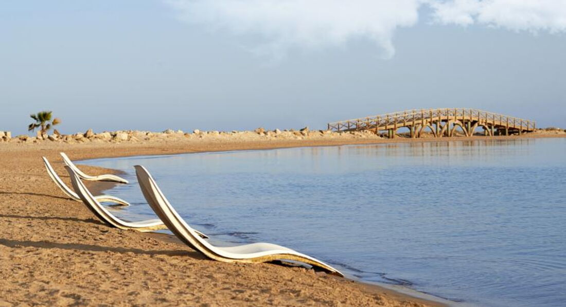 Пляж просто громадный, печанный, чистый. Зонтиков и лежаков достаточно, полотенца без карточек в любом количестве, лежаки снабжены матрасами и подушечками (не клеенчитами а покрытыми материалом) и дополнительно сверху положена простынка, которую регулярно меняют. Заход в море собственно на пляже пологий. чтобы плыть нужно прошагать метров тридцать, однако если отойти к западу от границы пляжа метров на 30, то там уже в 3-х метрах от берега можно плавать. Мы гуляли по берегу к западу от отеля на 1,5-2км. Сначала идет незастроенная территория, затем отрель "Робинзон", дальше недостроенный отель "Хият Регенси", дальше строящийся торговый центр. Кораллы есть на песчаной косе к востоку от отеля, но лучше смотреть кораллы с эстакады, которая метров на 400 ведет в открытое море, где есть два спуска в море. По эстакаде от дайвинг центра ходят автомобильчики. Дайвинг-центр находится метрах в 100 от восточной границы отеля.