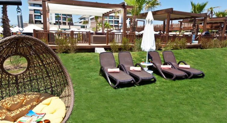 Возле отеля можно отдохнуть на травке на шезлонгах. На пляже тоже их было достаточно (возможно из-за сезона).