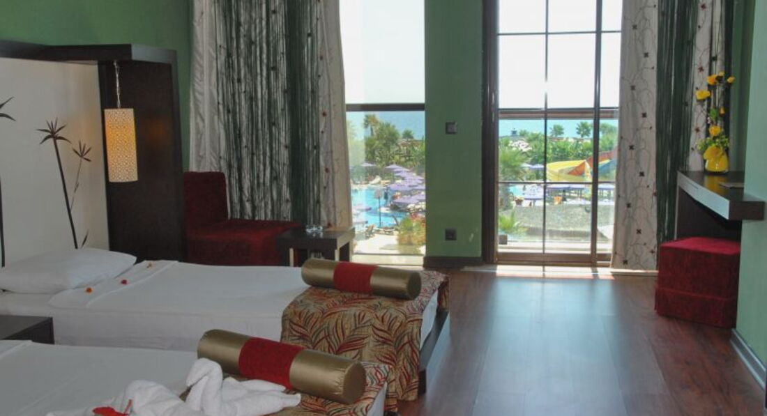 Отель расположен не в самом центре Белека, 15-20 минут от центра. Заселение в отель прошло быстро, сразу после приезда, так как были свободные номера. Номер мы брали семейный, двухуровневый и не пожалели. В номерах чисто, мебель новая не "ушатаная", кондиционеры и телевизоры работали исправно, на втором этаже огромная кровать, шкаф для одежды, трюмо и тумба с TV. Весь интерьер сделан в азиатском стиле. Уборка номера была ежедневно, к обеду было уже все чисто. Вид из всех номеров не на пляж, так как три корпуса стоят параллельно друг другу. Но это не напрягало.