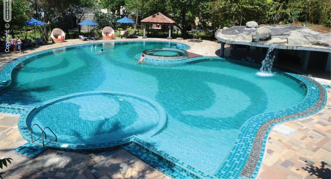 Отдыхали с27августа по 04 сентября 2015г. Произвело впечатлениеописание отеля в Интернете : в бассейне- вода из водопада, джакузи,много всякой живности вокруг,спокойный отдых. На деле оказалось,что водопад-это вода,стекавшая с крыши стилизованного под скалу строения,расположенного на краю бассейна.Кстати, за 9-ти дневное пребывание всего один раз видела эту картину,это происходило в день,когда в отеле отдыхали на выходных днях местные ланкийцы. В это же время и видела работающий в бассейне джакузи. Там тоже находилась группа местных детей.Привлекательного вида плетенные вместительные беседки (может это как-то называется иначе? Вообщем, комфортное укрытие от солнца!) также оказались не просто" для туристов сервис", а сервис за отдельную плату,которая указывалась на выставленных там ценниках. В интернете на этой красоте никаких ценников не показано.