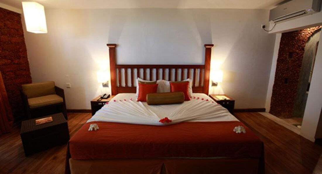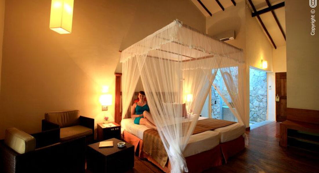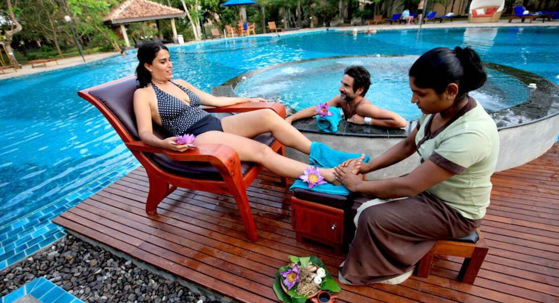 Отель по размещению хороший, номера комфортабельные, все работает. Номера делюкс в бунгало ближе к морю, минус- очень громко шумит океан, тяжело заснуть. Персонал в отеле не плохой, но в главном ресторане предвзято относится к туристам, которые приехали на отдых, а не по санаторной системе лечиться. В ресторане все хорошие места зарезервированы под санаторных. Остальных, сажают за грязные столы и долго не обслуживают. Еда, более чем скромная. Кто хочет похудеть - вам сюда ;)) Все просят чаевые, и не малые от 5-10 долларов. Ни в коем случае нельзя пить воду, заказывать напитки со льдом и даже есть мороженное. Расстройство кишечника и боли в желудке - это самое меньшее, что может с вами случиться. Об этом, ни один из туроператоров не предупреждает, хотя для европейских туристов- это обязательный пункт в оповещении при приезде в эту страну. Лучше, покупайте воду даже не в отеле, а в магазине, и все мойте ей. В ресторане есть стульчики для маленьких детей, и подходящее питание, но пока вы сами не попросите, никто вам даже не предложит. В аюрведическом салоне мастера хорошие, но почему-то один и тот же массаж разные мастера делают по разному. Так же, очень хотят чаевых, от 10 долларов каждый раз. В отеле есть русскоговорящая девушка, работает в аюрведа, может помочь с любой проблемой, даже сходить с вами в магазин. Все остальные общаются только на английском. Пляж гордской, песочный, но вход в море -булыжники. Нужно пройти метров 10-20 от отеля, до хорошего входы. отмечу бассейн, очень хороший с хорошей НЕ хлорированной водой. Утверждают, что вода из минеральных источников. Возможно и так. Для спокойного и тихого отдыха, для занятия собой и своим здоровьем, отель очень подходящий.
