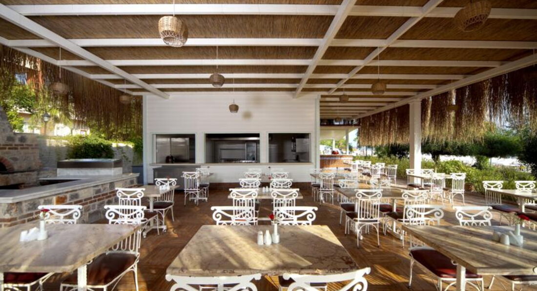 Питание очень хорошее, много овощей, зелени, салатов, сыров, а также масло оливковое, разнообразные соусы и заправки для них. Из мяса - курица, индейка, баранина в разном виде- тушеное, на гриле, на мангале. Рыба ежедневно - типа скумбрии. Фрукты - яблок, грейпфруты, апельсины, бананы, через день клубника! Завтраки стандартные - яйца во всех видах, сыры , очень вкусная и разнообразная выпечка, йогурты с кусочками фруктов, хлопья, блинчики, с шоколадом и медом . В баре на пляже - очень вкусные лепешки, с сыром, с грибами, с зеленью. Напитки - соки типа юпи, вино местное, пиво, был несколько раз айран, чаи и кофе. Десерты очень вкусные, постоянно что-то новенькое было, хотелось попробовать все!