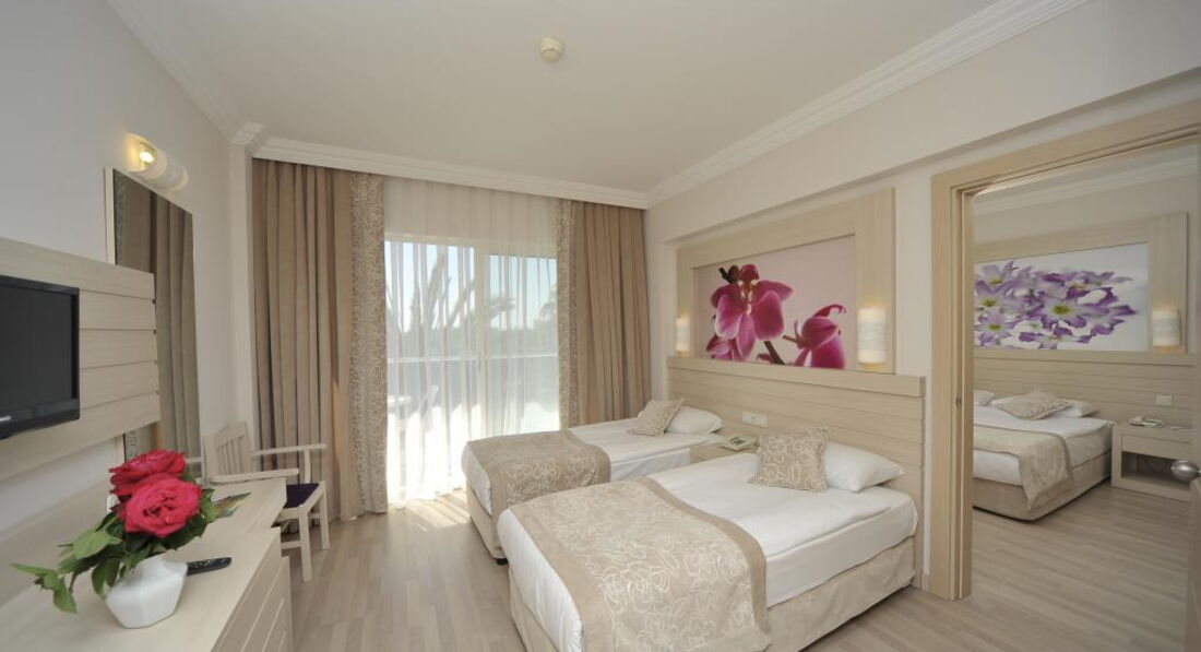 Отдыхали в отеле с 30.08 по 11.09 с ребенком 2,5 г и старшей 17 л.,в Турции не первый раз так что сравнить есть с чем. Когда выбирала отель то прочитала много отзывов как и положительных так и отрицательных. Отель оправдывает свои 4 звезды во всем. Единственнвая не точность так это растояние до моря метров 600 идти но нас это не напрягала, пляж песчаный и вход в море тоже песочек но на глубине имеются камни и достаточно большие. Да отель в основном заселен русскими-немцами, что очень даже приятно, анимация неплохая но в основном на немецком. Да вообщем то все было понятно без перевода, по самому действию. Огромный привет двум аниматорам Таня и Катя которые развлекали наших ребятишек, вечернее мини диско для малышей было просто праздником. По питанию могу сказать что очень даже прилично, разнообразное. Моей привереде в еде тоже всегда можно было что то выбрать. Ездили через Пегас, скажем так не ввосторге. Прилетели рано в 5.00 в отель приехали в 7.00 40$ и мы в 10.00 в номере дали нам сьют (2 ком), заказывали фэмили. Очень порадовал номер выходил на внутреннию территорию. Кондиционер у них центральный это минус, работал с 16.00 да так что по ночам урывались теплыми одеялами. Резюме хороший отель особенно для семейных с детьми. А отрицательное везде можно найти главное с чем ты приехал, мы ехали отдыхать и получать удовольствие от моря и солнца, а не искать минусы. Отдых удался все довольны.