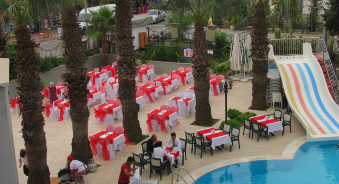 Отдыхали в середине мая 2017 с Анекстуром. Отель позиционируется как 4*. Обстановка не тянет и на 2*. Все старое. Хотя пишут что ремонт произведен в 2017. В номере не было ни одной дополнительной розетки поэтому телефон заряжали в ванной комнате положив на край раковины. Душевая кабина и сам душ времен очаковских никак не моложе. Вода после принятия душа благополучно скапливается на полу. Так что если в номере 2 человека то тот кто идет в душ вторым либо встает на мокрое полотенце либо в лужу. Это кому как нравится. В день приезда поразило ну очень скудное меню обеда и ужина. Три емкости на стойке с горячим и три с салатами. Помидоры огурцы отдельно и помидоры с огурцами вместе. Кондиционер не включали т.к. не было необходимости. Май все таки. Дверцы шкафа перекошены и до конца не закрываются. Полки отсутствуют. Только плечики. В номере была одна маленькая тумбочка с ящиком и небольшое зеркало. Через несколько дней случайно узнали что гид отеля уволился. Нового никто не представил. Увидели его тоже случайно накануне отъезда. Анамиция это отдельная песня. Проще говоря никакой. Хотя аниматор существует. А хамам! В крытом бассейне вода цветет. Может так и надо. Ведь май все таки. Вода в помещении с камнем зеленого цвета а миски которыми ее черпают склизкие. Через пару дней были приятно удивлены тем что меню обогатилось. Но оказалось что это было в честь праздника молодежи. Из фруктов только апельсины и яблоки. Яблоки не каждый день. Мы были в Турции уже 6 раз. Есть с чем сравнивать. Понимаем что сколько людей столько и мнений. Ну никак не тянет на 4*. Кстати у нас в ваучере стоял блок В. Жили в блоке А. Пытались узнать где же этот блок В находится чтобы хоть посмотреть на него. Никто из работников отеля толком не знает. Так что думайте сами решайте сами. К сожалению не догадались сделать фото