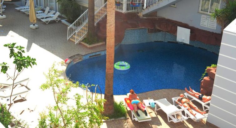 Территория вокруг отеля очень маленькая. Есть 2 бассейна: для детей и взрослых, несколько лежаков с зонтами (бесплатно).Бассейн в целом неплохой, вода не сильно хлористая. НО опять же плесень. Над бассейном сделаны большие декоративные камни, на них растет грибок, намокает и все это капает в воду. Это не слишком гигиенично.