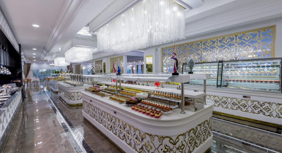 Еда. Завтрак всегда одно и тоже: омлет, яичница, сосиски, панкейки, , хлопья, творог, йогурты, мёд, джемы, много разного хлеба и булок, сыров. Фрукты сезонные и на завтрак, обед и ужин одинаковый набор, у нас были апельсины, слива, нектарины, персики, абрикосы, яблоки, арбузы и дыни. Булочки не очень вкусные, а вот хлеб хороший. Голодными не останетесь, если вам с утра стейк не нужен. Обед проходит возле бассейна: макароны, рис, картошка фри, овощи тушеные, рыба, курица, говядина, салаты, фрукты и много пироженок. Пироженные, надо отдать должное, в этом отеле печь умеют, это не просто формальный бисквит намазанный растительными сливками, чего там только нет и чизкейки разных видов даже чизкейк- красный бархат, и медовики, и какие-то фисташковые и маковые. Раздолье для сладкоежек. А если вы не наедитесь в обед и ужин тортиком, то на том же этаже, где находиться ресторан есть кондитерская (работает с 10.00-16.00) можете там поесть ещё с чайком)). Ужин всегда есть 3 вида мяса, 2 вида рыбы и сколько-то видов курицы, очень много овощей, много гарниров опять же торты и фрукты. Ужины очень хорошие. Напитки на обедах и ужинах разносят официанты.