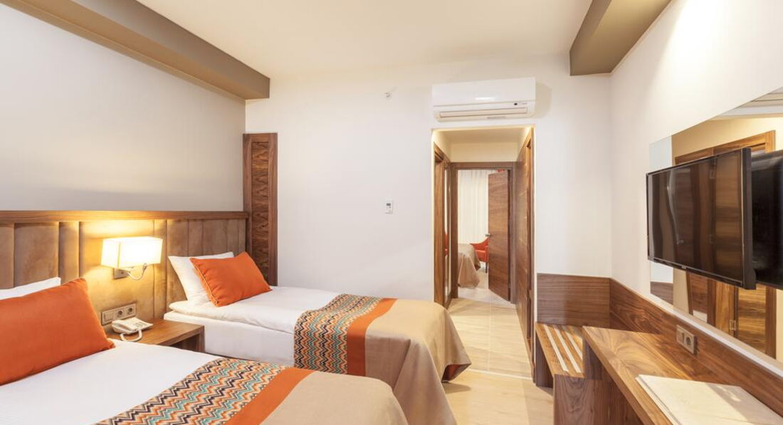 Номер: нам достался номер 2006, который выходил на террасу нашего же отеля, с балконом, потолки низковаты. Фото номера соответствует его содержанию. Все новое, хорошего качества, не очень большой номер, компактно, но все есть. Единственное что беспокоило (не особо, но для информации напишу) - так как терраса была на том же этаже что и наш номер, напротив нашего балкона в метре от него стоял столик с мягкой зоной (таких зон кстати много на террасе), где с 20.00 сидят постояльцы отеля, пьют, курят, общаются. Это не смущало нас так сильно, т.к. при заезде 90 % отдыхающих были тихие немцы после 50 лет. Один раз под конец отпуска была компания украинских граждан, вот они реально шумно отдыхали, с криками и шумным обсуждением. Мы с ребенком 4,5 лет отдыхали...Поэтому не особо удобны номера на этом этаже кто любит поспать после 22.00 или семей с маленькими детьми как мы.Удобства в номере все есть: холодильник с водой, колой, фантой, чайник с чашками, кофе, чаем и даже сливками, фен, бесплатный сейф. Вайфай хорошо работал в номере без доп оплаты, т.к. номер наш был недалеко от ресепшен. А так он платный в номере. Самый большой и главный минус отеля это кондиционер. Он висит в номере как обычный независимый кондиционер. Однако он подключен к общей системе вентиляции. Номер у нас выходил на солнечную сторону, плюс его маленькая площадь и низкие потолки давали невыносимую духоту. Так вот кондиционер с 19 градусами на холод работал днем с 12.00 до 14.00, и вечером с 19.00 до 2.00 ночи. Остальное все вентиляция, которая просто не помогала. Приходишь в духоту спать днем в 14.00 после окончания работы горок (из за ребенка, кто не спит днем этот минус конечно не учитывается), спать не возможно, вечером та же ерунда, т.к. приходишь после ужина или с прогулки около 23.00 в ту же духоту (кондиционер и все электричество в номере работает от карточки, которая выдается одна на номер) и пока кондиционер охладит комнату, уже все отключается на вентиляцию. А балкон открывать не вариант, за окном слышно кто о чем говорит или музыка играет достаточно шумно (2 раза в неделю была живая музыка). Поэтому оценку 4 я поставила именно из за экономии отеля на электроэнергии и соответственно работы кондиционера по часам.