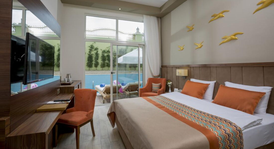Привет всем...Летели из Казани турецкими авиалиниями...это конечно жесть....даже мой муж отметил, что пилоты - камикадзе...летели с маленьким ребенком-жаловалась на ушки, чего раньше не замечали.Из питания одни сухие бутерброды, который ребенку давать не рискнула.Привезли в отель быстро, заселили тоже быстро...номер 2018 выходит на бассейн другого отеля, но как оказалось сторона северная и нам повезло, нам не было душно и кондей мы не включали... но вечером там была дискотека и было о-о-очень шумно часов до 2 ночи... Питание отеля своеобразное: для сладкоежек!!!! они готовы были всех закормить пирожными и тортами!!! Да - это вкусно, но не все готовы умереть в расцвете лет от сахарной комы. Лучше было бы фрукты... С ними как раз напряг большой... Дыни, арбузы клубника 2 раза !!! за 2 недели! Это в сезон клубники! Черешни ни разу!!! Жесть! Мы обиделись на Турцию...Супы нормальные, но всегда нужно пробовать, так как очень любят турки добавлять в суп очень жгучий перец, кушать не возможно. Рыбы очень мало. Мясо есть, но всегда тушеное. Сыры вкусные. Завтраки- всегда не знали чем покормить ребенка. Каши не понравились-это были скорее супы молочные. Йогуртов много, но они все кислые на вкус. Колбаса, сосиски соевые. Остаются булки, оладушки и яица всех видов - за 2 недели очень надоело. Ну В целом питание- с голоду не умерли- даже поправились, но и вкусненького ничего кроме тортов не поели. Даааа! Отдельно для отеля напишу- очереди в ресторанах напрягают оочень!!! Но эти очереди в основном за картошкой фри!!! Да-да! Уберите вы ее на отдельный стол!!!