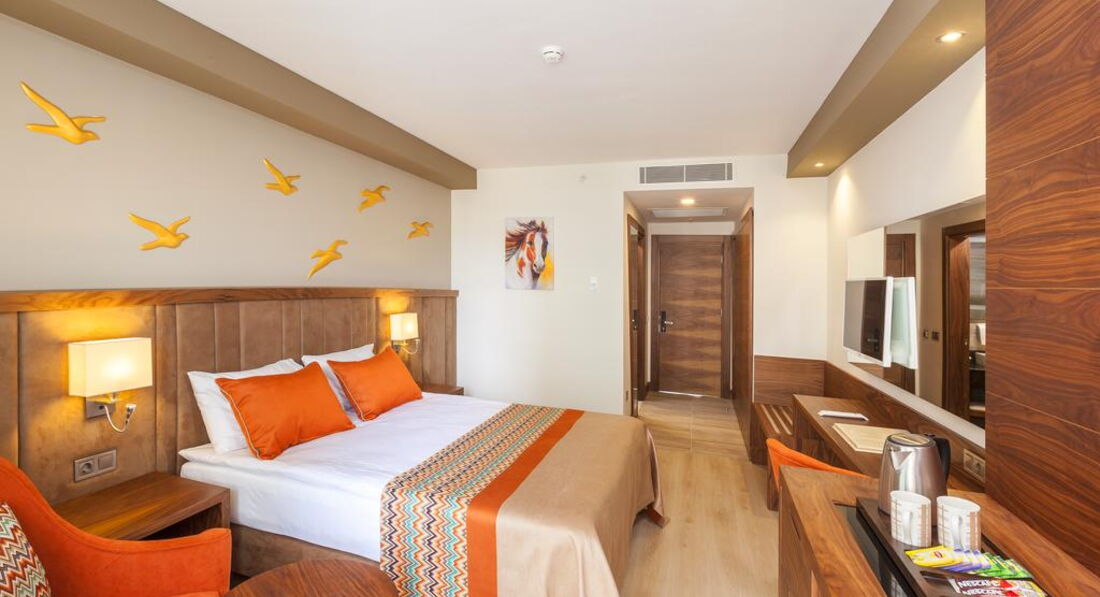 Вид комнаты совпадает с картинкой на сайте, все там нормально претензий нет. Мини бар бесплатный там вода питьевая, газировка, кола и фанта вроде- не помню, так как не пьём такое) телевизор 3 русских канала и куча других на которых и мультики показывают и музыку крутят, короче если вы в отпуске без телека никак, то вам есть что посмотреть). Сейф бесплатный. Вай-фай у нас в номере работал. Подушки не удбные.