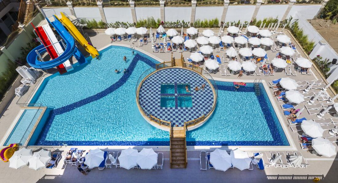 У отеля свой бассейн. Пляж - 240 м от отеля, можно пешком по прямой по асфальту или возле отеля автобус курсирует непрерывно на пляж. Главный холл - 0 этаж, Ресторан -1 этаж, зона СПА, фитнеса -2 этаж, там же выдают полотенца для бассейна, пляжа. Еда разнообразная, все вкусно. На пляже отельный ресторан/кафе, где с 10 утра уже наливают, с 12-30 до 17-00 кормят. В обед можно пообедать прям на пляже (все бесплатно) - овощи, фрукты, салаты, горячие блюда, фаст-фуд - бургеры, пицца, шаверма и т,д., гезлеме, вода, айран, мороженое. Лежаков на всех хватает, берег - песок, ровный чистый постепенный вход в море, море чистое. В целом обслуживание хорошее, можно сказать на отлично, очень стараются. Фитнес-зал, как всегда, все основное имеется. Спа-зона - посещение хамама, сауны бесплатно. Главное, что мне очень понравилось - побережье протяженностью примерно километра 2,5 - 3, вся набережная выложена брусчаткой, по вечерам очень классно гулять, людно и не страшно. От отеля в любую сторону базары, аптеки, можно купить вещи (кто любит...), сувениры, сладости и т.д. До старого города можно доехать на городском автобусе, остановка недалеко. И главное, что не понравилось: было очень-очень шумно по ночам из-за дискотеки, проходившей ежедневно в кафе-ресторане, расположенном в метрах 150 от отеля. Музыка громыхает до 3 - 4 утра. Крайний раз, за один день до отъезда, громыхала музыка до 04-10, увы. Спасение от этого - полностью закрыть балкон, но тогда становится душно. Если включить кондиционер, лично меня сразу продувает. Так что именно это было единственным минусом. Кстати, по данному поводу люди неоднократно жаловались на ресепшн, но отельные сказали, что ничего не могут сделать. Видимо нет у них законодательства, регулирующего "ночные децибелы". Резюмируя, скажу, что ехать в этот отель можно, не раздумывайте. Это мне лично попался номер, выходящий окнами на кафе с громкой музыкой, другая сторона говорила, что им не слышно. В общем всё хорошо, не раздумывайте.