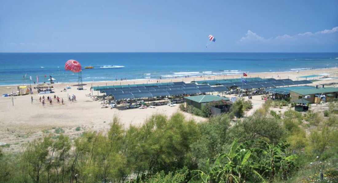 Пляж-СУПЕР!!!! МОРЕ необыкновенно чистое с прекрасным песчаным и пологим входом в него.Вода прозрачна даже когда немного штормит. Лежаков с матрасиками всем хватает. Большие навесы спасают от палящего солнца,а в баре на пляже можно утолить жажду (пиво,вино,чай ,кофе,холодный айран) и покушать в обед.