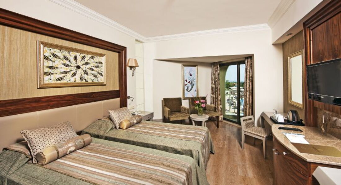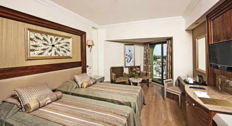 Отдыхали в сентябре 2013г. От аэропорта доехали за 1 час, высадили первыми. На ресепшене предложили сначала поужинать, а потом уже мы прошли в номер. Номер не очень большой, но очень уютный. Есть чайник(+пакетики чая и кофе,сахар). В мини-баре вода, кола,пепси, пиво. В ванной набор мини(гель, шампунь, и всякая мелочь). Убираются в номере каждый день,бар тоже пополняют каждый день. Еды в ресторане выбор большой,на любой вкус,нам понравилось. Были приятно удивлены тем, что всегда в зале присутствовал шеф-повар. Вино из бутылок официанты стараются наливать очень оперативно. Деткам по просьбе могут даже чай принести, хотя автоматы для чая и кофе стоят недалеко. По четвергам в отеле День Турции. Украшают столы, встречают гостей с бокалами вина,зажигают фейерверки прямо на воде в бассейне. Ну и конечно, шоу с горящим торт-мороженое. Великолепный берег, пологий песчаный, заход очень плавный, вода чистейшая,вокруг пляжа отеля рядом других отельных пляжей нет. По берегу приятно пройтись в сторону небольшой бухты, там же можно сделать симпатичные фото.На пляже в баре можно перекусить в обед. Сходили в хамам при отеле. Очень понравилось,особенно массаж. Причем, может быть это кому-нибудь важно,женщинам массаж делают женщины, а мужчинам-мужчины. Рядом с отелем магазинов нет,но если пойти от отеля направо и далее вдоль дороги минут 15мин. то перед Вами будет рынок. Там можно купить в подарок приличные поло,сладости и т.д. Может быть отзыв не очень красноречивый, но думаю, то, что мы решили вернуться сюда опять говорит сам себя.
